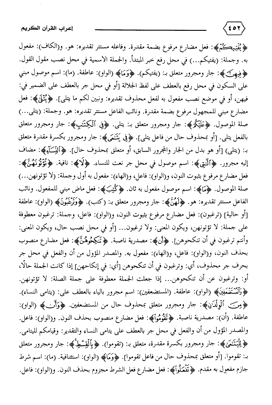 فيهن، أو في موضع نصب مفعول به لفعل محذوف تقديره: ونبين لكم ما يتلى]. {يُتْلى}: فعل مضارع مبني للمجهول مرفوع بضمة مقدرة. ونائب الفاعل مستتر تقديره: هو. وجملة: (يتلى ... ) صلة الموصول. {عَلَيْكُمْ}: جار ومجرور متعلق ب: يتلى. {فِي الْكِتابِ}: جار ومجرور متعلق بالفعل يتلى. [أو بمحذوف حال من فاعل يتلى]. {فِي يَتامَى}: جار ومجرور بكسرة مقدرة متعلق ب: (يتلى) [أو هو بدل من الجار والمجرور السابق، أو متعلق بمحذوف حال]. {النِّساءِ}: مضاف إليه مجرور. {اللاّتِي}: اسم موصول في محل جر نعت للنساء. {لا}: نافية. {تُؤْتُونَهُنَّ}: