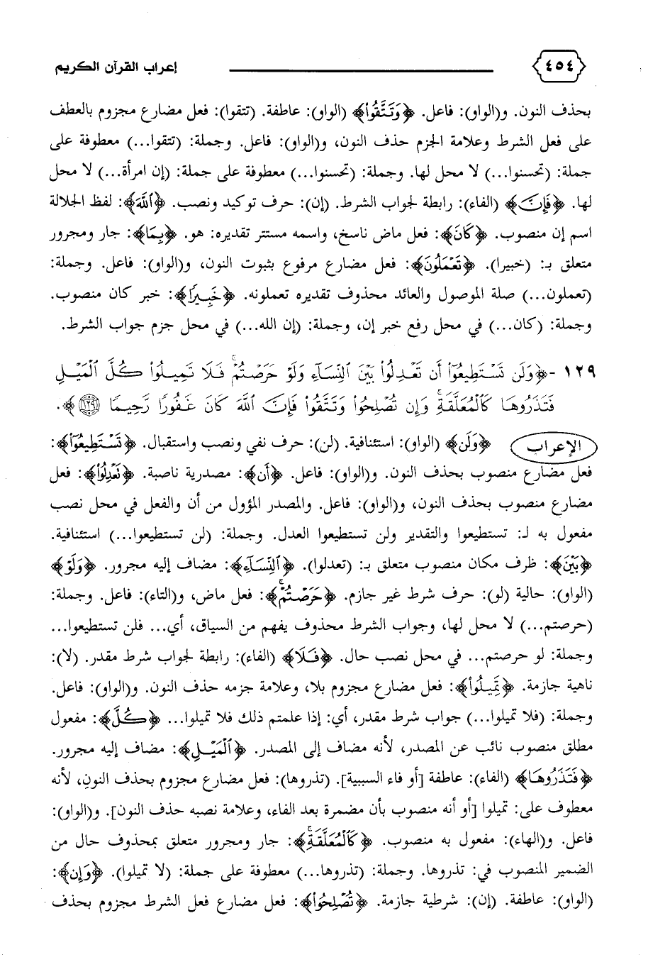 فعل مضارع منصوب بحذف النون. و (الواو): فاعل. {أَنْ}: مصدرية ناصبة. {تَعْدِلُوا}: فعل مضارع منصوب بحذف النون، و (الواو): فاعل. والمصدر المؤول من أن والفعل في محل نصب مفعول به ل: تستطيعوا والتقدير ولن تستطيعوا العدل. وجملة: (لن تستطيعوا ... ) استئنافية.