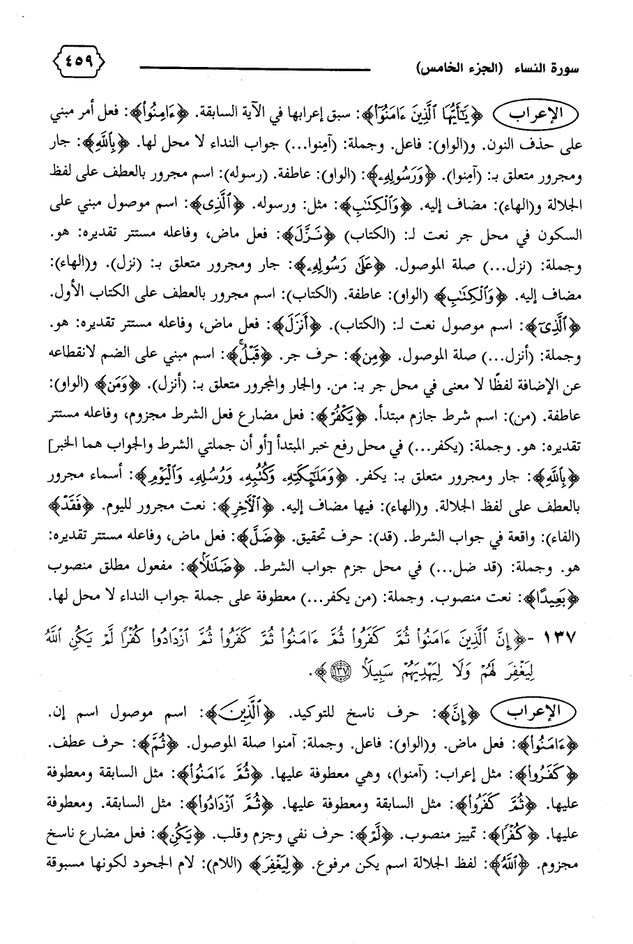 {يا أَيُّهَا الَّذِينَ آمَنُوا}: سبق إعرابها في الآية السابقة. {آمَنُوا}: فعل أمر مبني على حذف النون. و (الواو): فاعل. وجملة: (آمنوا ... ) جواب النداء لا محل لها. {بِاللهِ}: جار ومجرور متعلق ب: (آمنوا). {وَرَسُولِهِ}: (الواو): عاطفة. (رسوله): اسم مجرور بالعطف على لفظ الجلالة و (الهاء): مضاف إليه. {وَالْكِتابِ}: مثل: ورسوله. {الَّذِي}: اسم موصول مبني على السكون في محل جر نعت ل: (الكتاب) {نَزَّلَ}: فعل ماض، وفاعله مستتر تقديره: هو.