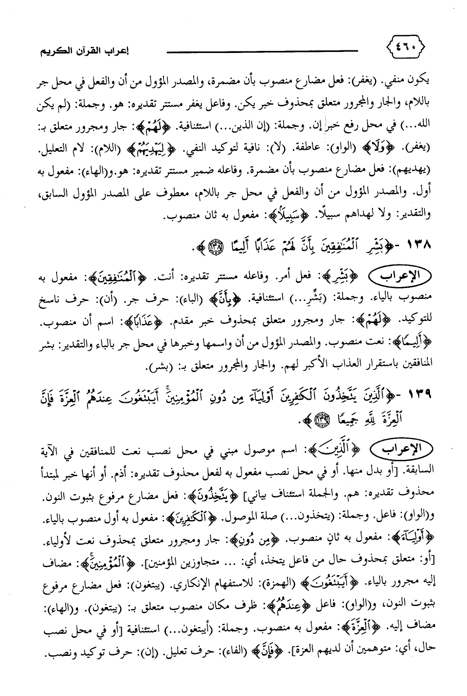 [أو: متعلق بمحذوف حال من فاعل يتخذ، أي: ... متجاوزين المؤمنين]. {الْمُؤْمِنِينَ}: مضاف إليه مجرور بالياء. {أَيَبْتَغُونَ} (الهمزة): للاستفهام الإنكاري. (يبتغون): فعل مضارع مرفوع بثبوت النون، و (الواو): فاعل {عِنْدَهُمُ}: ظرف مكان منصوب متعلق ب: (يبتغون).و (الهاء):