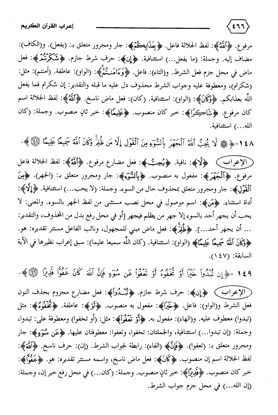{لا}: نافية. {يُحِبُّ}: فعل مضارع مرفوع. {اللهُ}: لفظ الجلالة فاعل مرفوع. {الْجَهْرَ}: مفعول به منصوب. {بِالسُّوءِ}: جار ومجرور متعلق ب: (الجهر). {مِنَ الْقَوْلِ}: جار ومجرور متعلق بمحذوف حال من السوء. وجملة: (لا يحب ... ) استئنافية. {إِلاّ}: