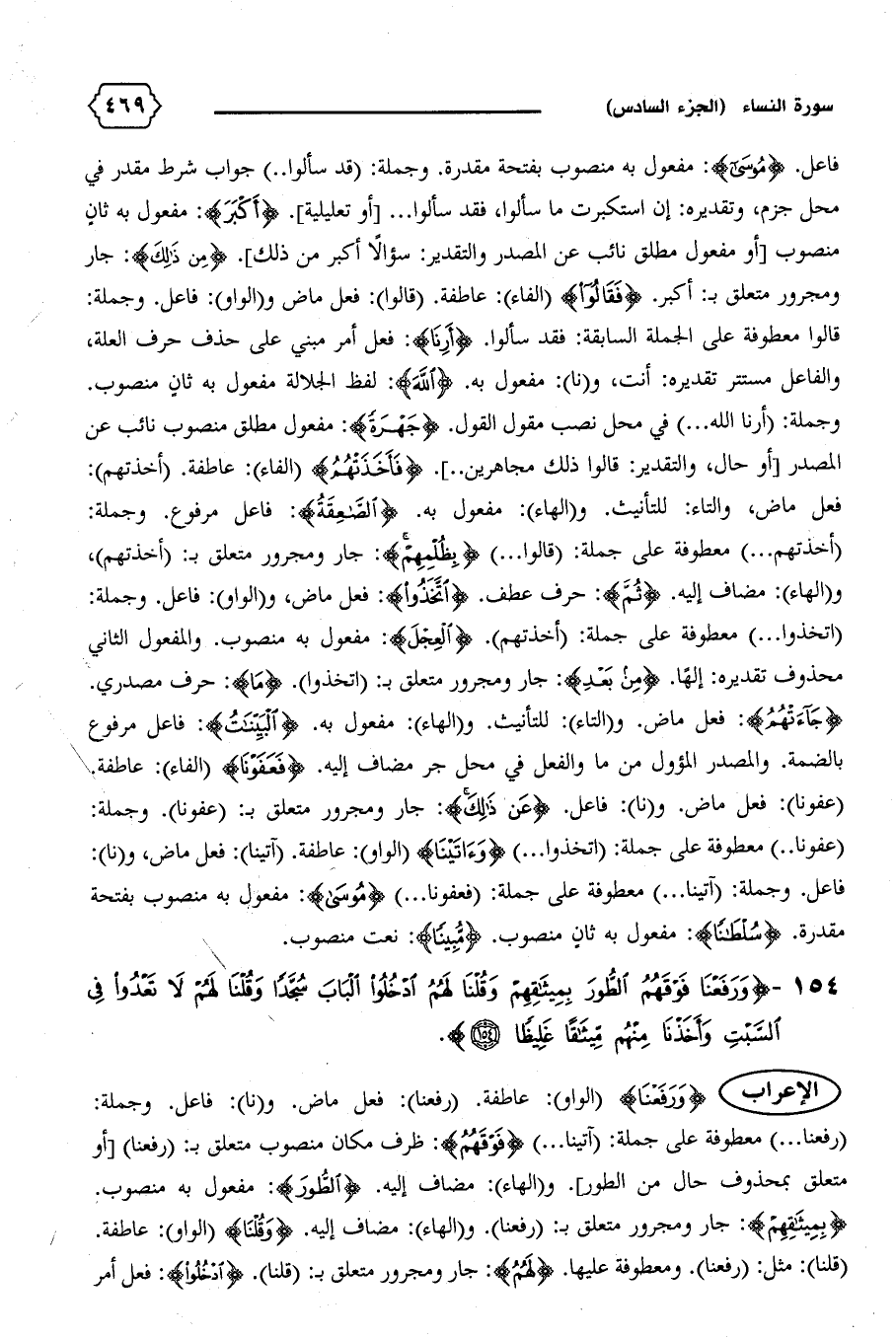 فاعل. {مُوسى}: مفعول به منصوب بفتحة مقدرة. وجملة: (قد سألوا ... ) جواب شرط مقدر في محل جزم، وتقديره: إن استكبرت ما سألوا، فقد سألوا ... [أو تعليلية]. {أَكْبَرَ}: مفعول به ثان منصوب [أو مفعول مطلق نائب عن المصدر والتقدير: سؤالا أكبر من ذلك]. {مِنْ ذلِكَ}: جار ومجرور متعلق ب: أكبر. {فَقالُوا} (الفاء): عاطفة. (قالوا): فعل ماض و (الواو): فاعل. وجملة: