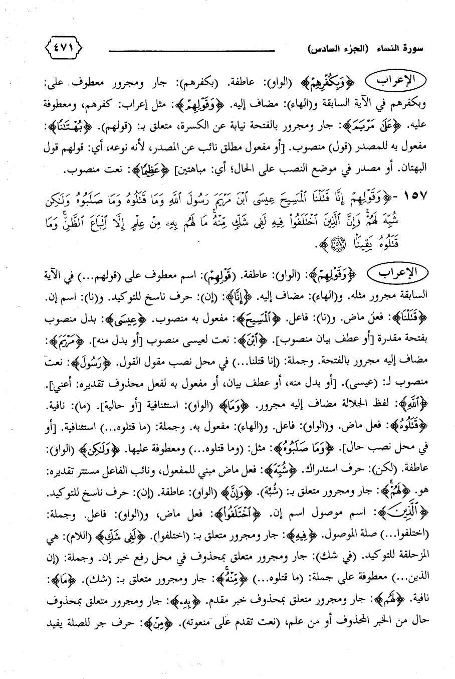 ١٥٧ - {وَقَوْلِهِمْ إِنّا قَتَلْنَا الْمَسِيحَ عِيسَى اِبْنَ مَرْيَمَ رَسُولَ اللهِ وَما قَتَلُوهُ وَما صَلَبُوهُ وَلكِنْ شُبِّهَ لَهُمْ وَإِنَّ الَّذِينَ اِخْتَلَفُوا فِيهِ لَفِي شَكٍّ مِنْهُ ما لَهُمْ بِهِ مِنْ عِلْمٍ إِلَاّ اِتِّباعَ الظَّنِّ وَما قَتَلُوهُ يَقِيناً (١٥٧)}