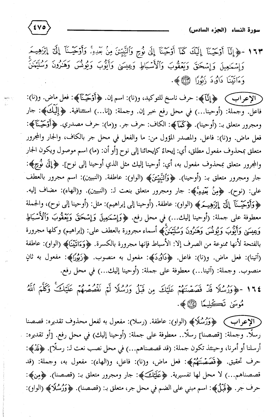 ١٦٣ - {إِنّا أَوْحَيْنا إِلَيْكَ كَما أَوْحَيْنا إِلى نُوحٍ وَالنَّبِيِّينَ مِنْ بَعْدِهِ وَأَوْحَيْنا إِلى إِبْراهِيمَ وَإِسْماعِيلَ وَإِسْحاقَ وَيَعْقُوبَ وَالْأَسْباطِ وَعِيسى وَأَيُّوبَ وَيُونُسَ وَهارُونَ وَسُلَيْمانَ وَآتَيْنا داوُدَ زَبُوراً (١٦٣)}