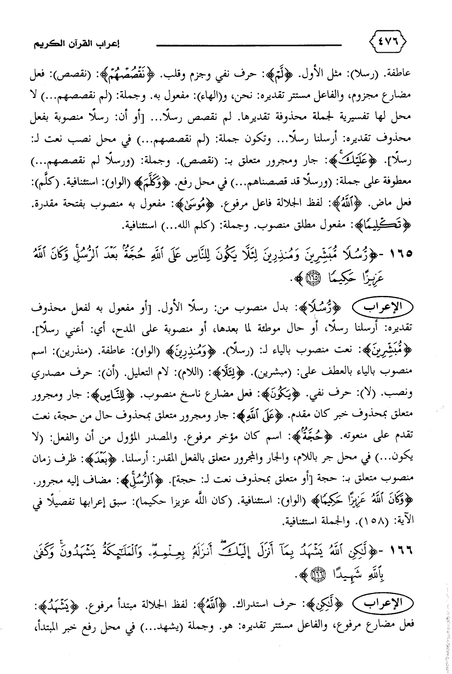 {مُبَشِّرِينَ}: نعت منصوب بالياء ل: (رسلا). {وَمُنْذِرِينَ} (الواو): عاطفة. (منذرين): اسم منصوب بالياء بالعطف على: (مبشرين). {لِئَلاّ}: (اللام): لام التعليل. (أن): حرف مصدري ونصب. (لا): حرف نفي. {يَكُونَ}: فعل مضارع ناسخ منصوب. {لِلنّاسِ}: جار ومجرور متعلق بمحذوف خبر كان مقدم. {عَلَى اللهِ}: جار ومجرور متعلق بمحذوف حال من حجة، نعت تقدم على منعوته. {حُجَّةٌ}: اسم كان مؤخر مرفوع. والمصدر المؤول من أن والفعل: (لا يكون ... ) في محل جر باللام، والجار والمجرور متعلق بالفعل المقدر: أرسلنا. {بَعْدَ}: ظرف زمان منصوب متعلق ب: حجة [أو متعلق بمحذوف نعت ل: حجة]. {الرُّسُلِ}: مضاف إليه مجرور.