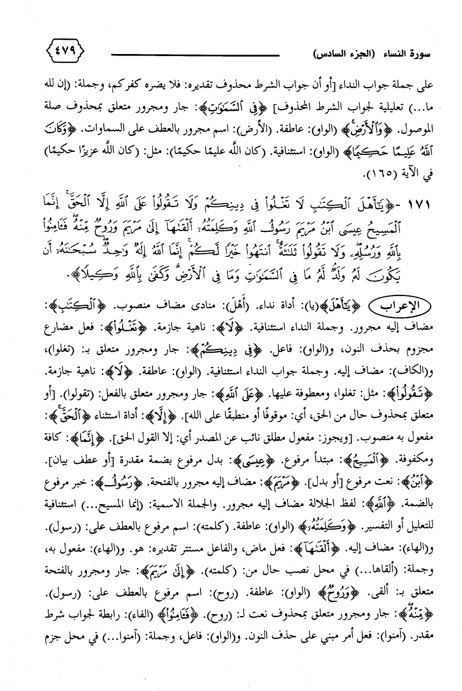 ١٧١ - {يا أَهْلَ الْكِتابِ لا تَغْلُوا فِي دِينِكُمْ وَلا تَقُولُوا عَلَى اللهِ إِلَاّ الْحَقَّ إِنَّمَا الْمَسِيحُ عِيسَى اِبْنُ مَرْيَمَ رَسُولُ اللهِ وَكَلِمَتُهُ أَلْقاها إِلى مَرْيَمَ وَرُوحٌ مِنْهُ فَآمِنُوا بِاللهِ وَرُسُلِهِ وَلا تَقُولُوا ثَلاثَةٌ اِنْتَهُوا خَيْراً لَكُمْ إِنَّمَا اللهُ إِلهٌ واحِدٌ سُبْحانَهُ أَنْ يَكُونَ لَهُ وَلَدٌ لَهُ ما فِي السَّماواتِ وَما فِي الْأَرْضِ وَكَفى بِاللهِ وَكِيلاً (١٧١)}