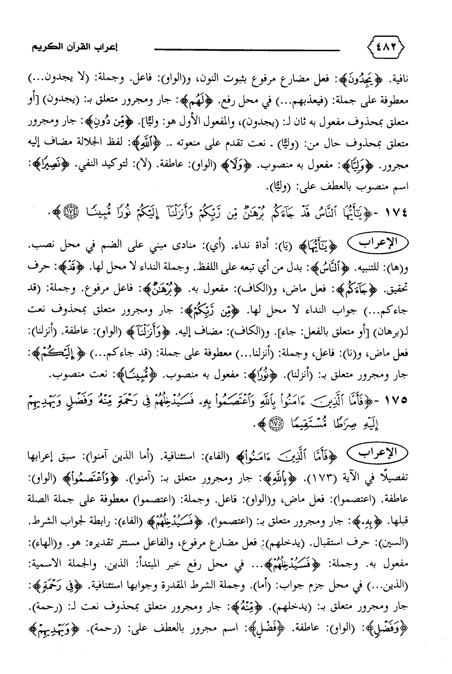 و (ها): للتنبيه. {النّاسُ}: بدل من أي تبعه على اللفظ. وجملة النداء لا محل لها. {قَدْ}: حرف تحقيق. {جاءَكُمْ}: فعل ماض، و (الكاف): مفعول به. {بُرْهانٌ}: فاعل مرفوع. وجملة: (قد جاءكم ... ) جواب النداء لا محل لها. {مِنْ رَبِّكُمْ}: جار ومجرور متعلق بمحذوف نعت ل (برهان) [أو متعلق بالفعل: جاء].و (الكاف): مضاف إليه. {وَأَنْزَلْنا} (الواو): عاطفة. (أنزلنا):