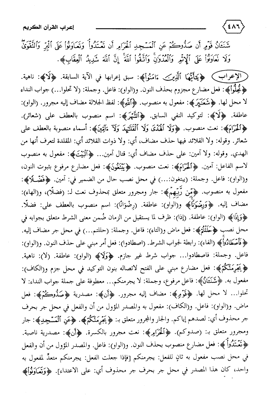مفعول به. {شَنَآنُ}: فاعل مرفوع، وجملة: لا يجرمنكم ... معطوفة على جملة جواب النداء: لا تحلوا ... لا محل لها. {قَوْمٍ}: مضاف إليه مجرور. {أَنْ}: مصدرية {صَدُّوكُمْ}: فعل ماض. و (الواو): فاعل. و (الكاف): مفعول به والمصدر المؤول من أن والفعل في محل جر بحرف جر محذوف أي: لصدهم إياكم. والجار والمجرور متعلق ب: {يَجْرِمَنَّكُمْ}. {عَنِ الْمَسْجِدِ}: جار ومجرور متعلق ب: (صدوكم). {الْحَرامَ}: نعت مجرور بالكسرة. {أَنْ}: مصدرية ناصبة.