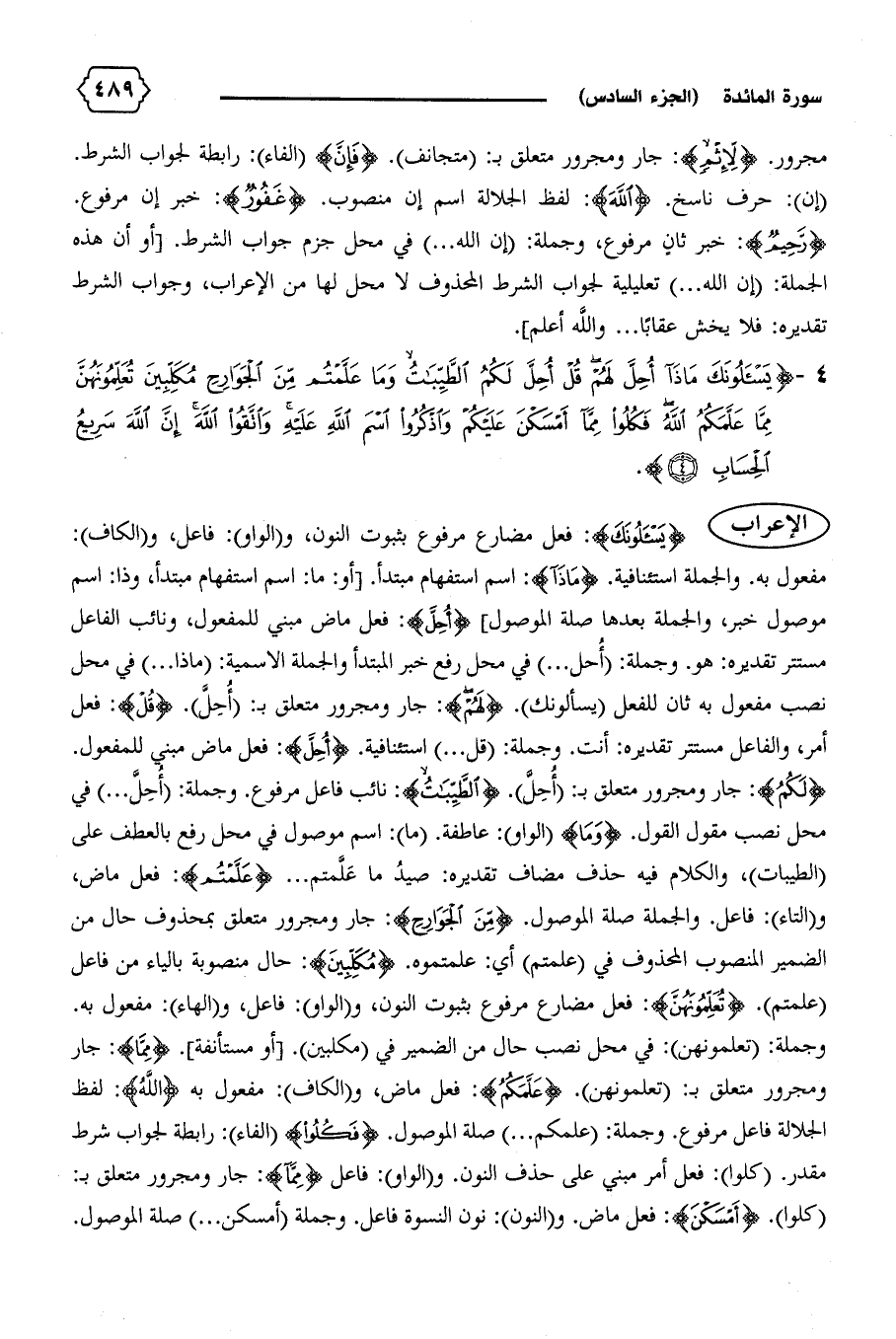 {لَكُمُ}: جار ومجرور متعلق ب: (أحلّ). {الطَّيِّباتُ}: نائب فاعل مرفوع. وجملة: (أحلّ ... ) في محل نصب مقول القول. {وَما} (الواو): عاطفة. (ما): اسم موصول في محل رفع بالعطف على (الطيبات)، والكلام فيه حذف مضاف تقديره: صيد ما علّمتم ... {عَلَّمْتُمْ}: فعل ماض، و (التاء): فاعل. والجملة صلة الموصول. {مِنَ الْجَوارِحِ}: جار ومجرور متعلق بمحذوف حال من الضمير المنصوب المحذوف في (علمتم) أي: علمتموه. {مُكَلِّبِينَ}: حال منصوبة بالياء من فاعل (علمتم). {تُعَلِّمُونَهُنَّ}: فعل مضارع مرفوع بثبوت النون، و (الواو): فاعل، و (الهاء): مفعول به.