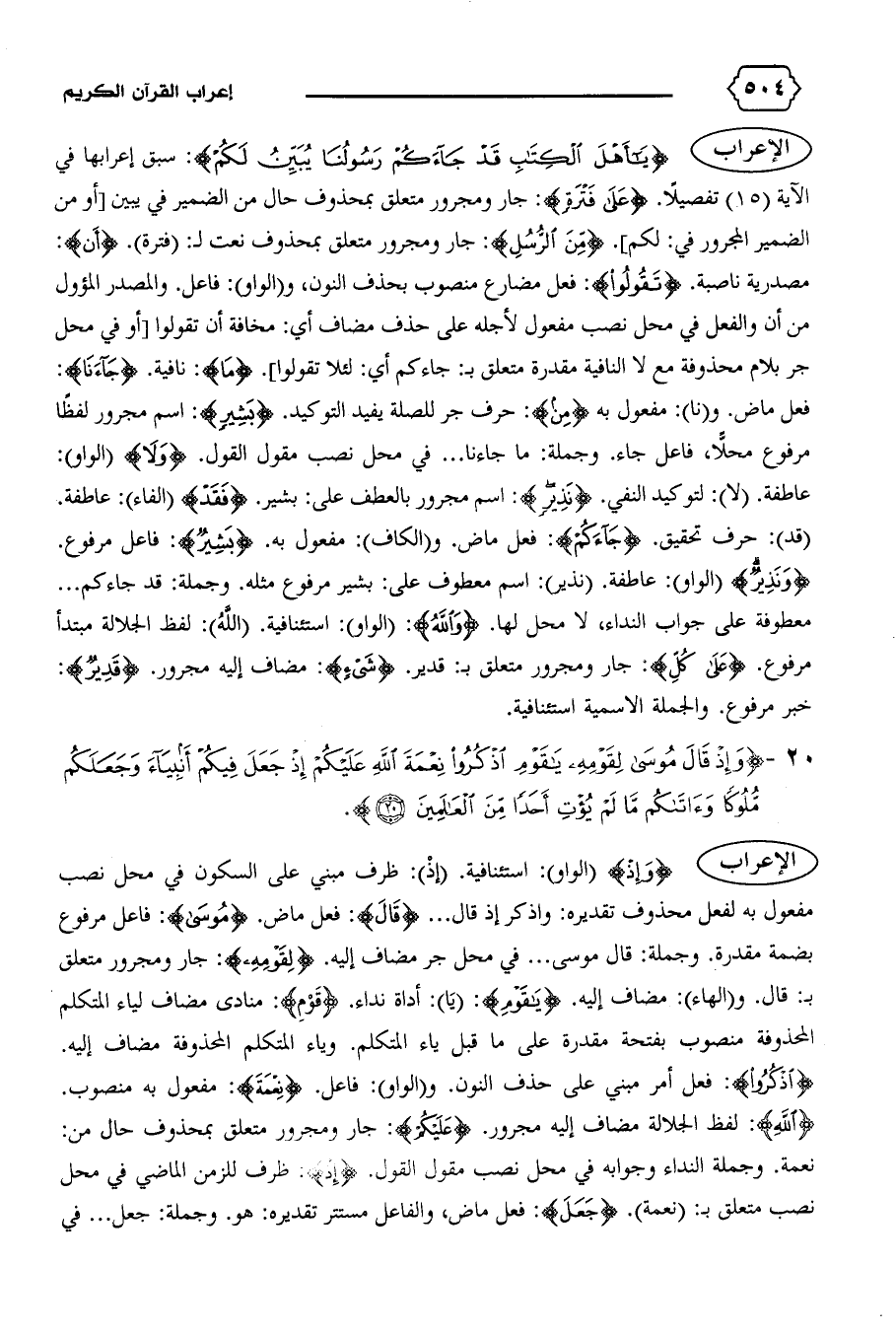{يا أَهْلَ الْكِتابِ قَدْ جاءَكُمْ رَسُولُنا يُبَيِّنُ لَكُمْ}: سبق إعرابها في الآية (١٥) تفصيلا. {عَلى فَتْرَةٍ}: جار ومجرور متعلق بمحذوف حال من الضمير في يبين [أو من الضمير المجرور في: لكم]. {مِنَ الرُّسُلِ}: جار ومجرور متعلق بمحذوف نعت ل: (فترة). {أَنْ}: