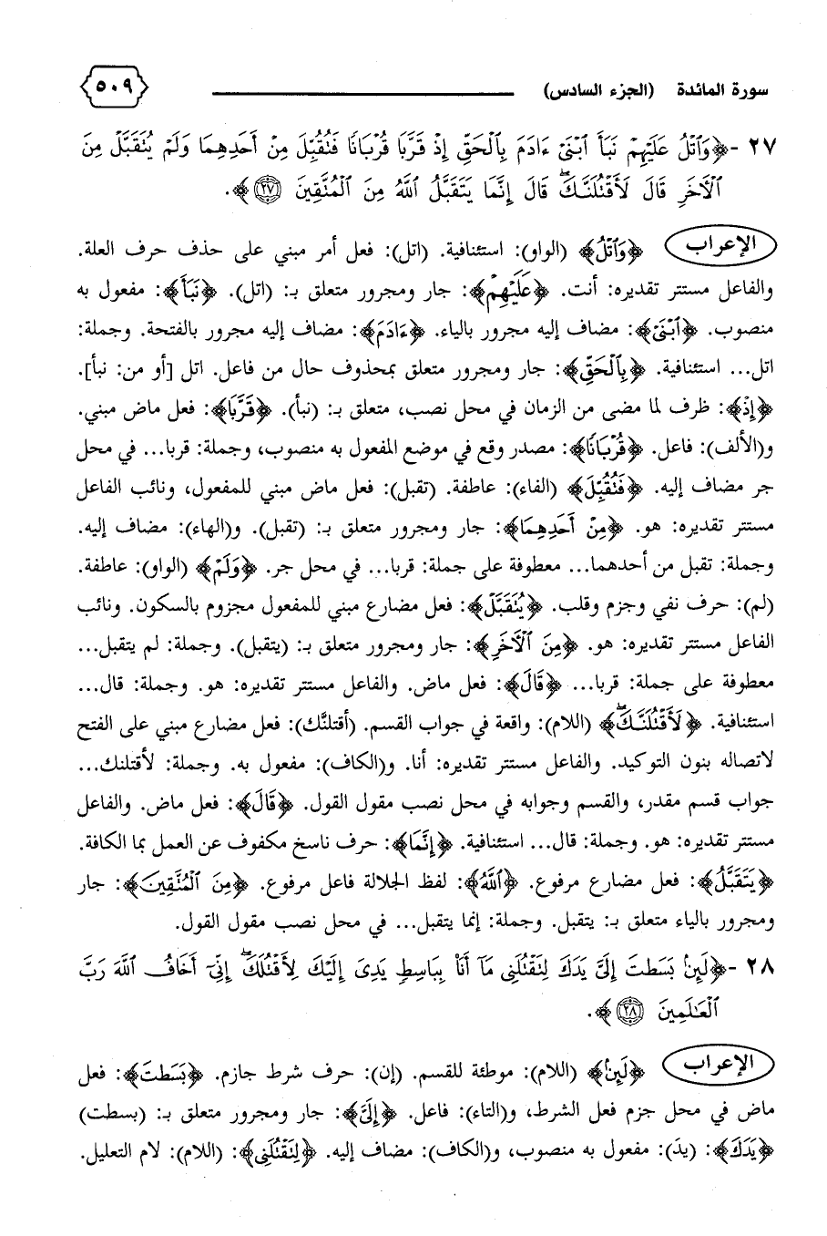 والفاعل مستتر تقديره: أنت. {عَلَيْهِمْ}: جار ومجرور متعلق ب: (اتل). {نَبَأَ}: مفعول به منصوب. {اِبْنَيْ}: مضاف إليه مجرور بالياء. {آدَمَ}: مضاف إليه مجرور بالفتحة. وجملة: