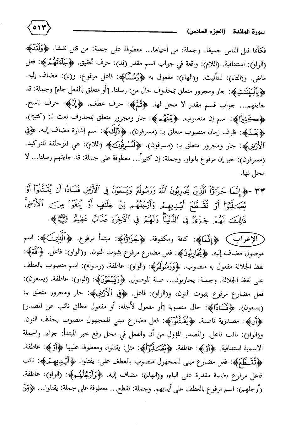 (يسعون). {فَساداً}: حال منصوبة [أو مفعول لأجله، أو مفعول مطلق نائب عن المصدر] {أَنْ}: مصدرية ناصبة. {يُقَتَّلُوا}: فعل مضارع مبني للمجهول منصوب بحذف النون.