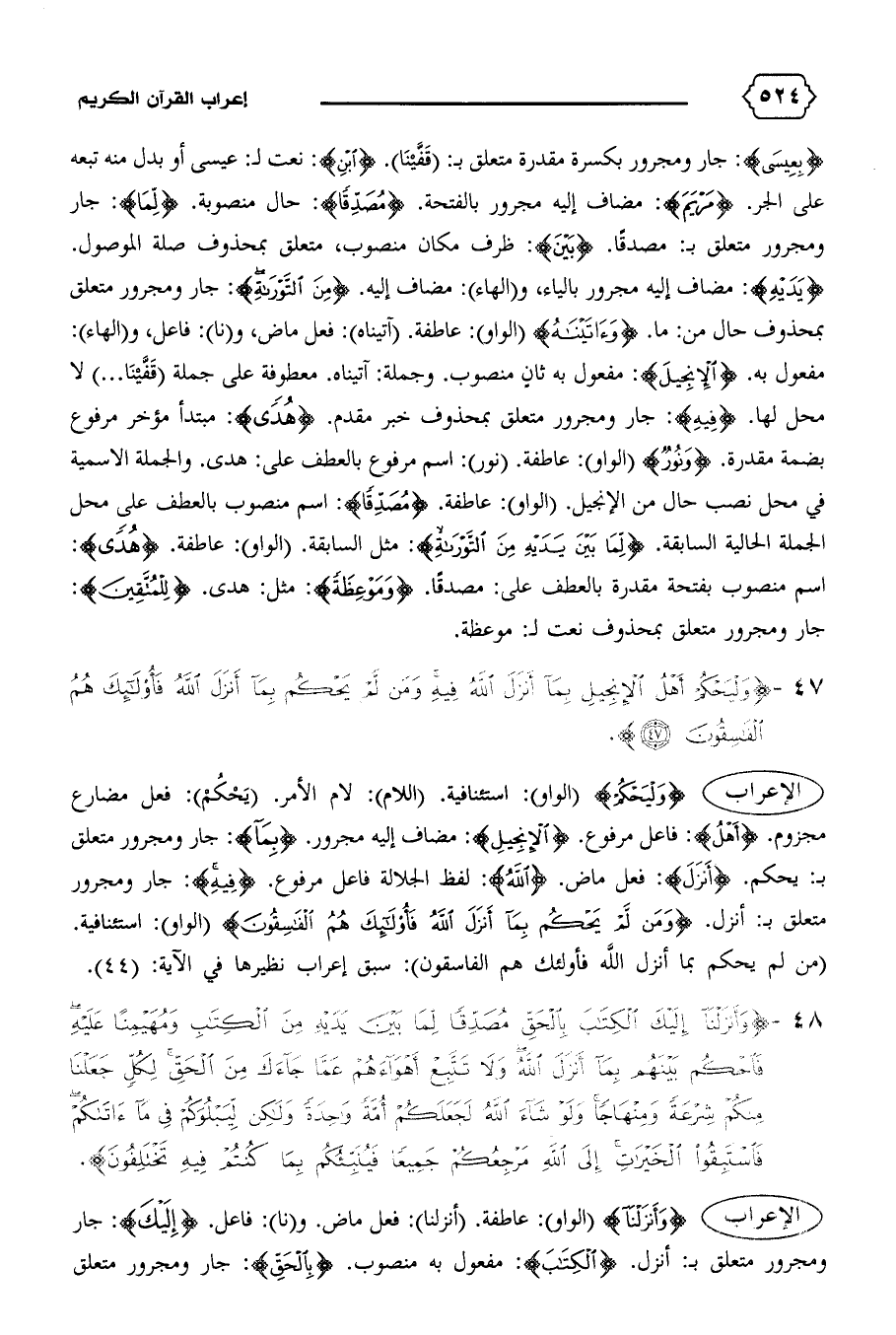 {وَلْيَحْكُمْ} (الواو): استئنافية. (اللام): لام الأمر. (يحكم): فعل مضارع مجزوم. {أَهْلُ}: فاعل مرفوع. {الْإِنْجِيلِ}: مضاف إليه مجرور. {بِما}: جار ومجرور متعلق ب: يحكم. {أَنْزَلَ}: فعل ماض. {اللهُ}: لفظ الجلالة فاعل مرفوع. {فِيهِ}: جار ومجرور متعلق ب: أنزل. {وَمَنْ لَمْ يَحْكُمْ بِما أَنْزَلَ اللهُ فَأُولئِكَ هُمُ الْفاسِقُونَ} (الواو): استئنافية.