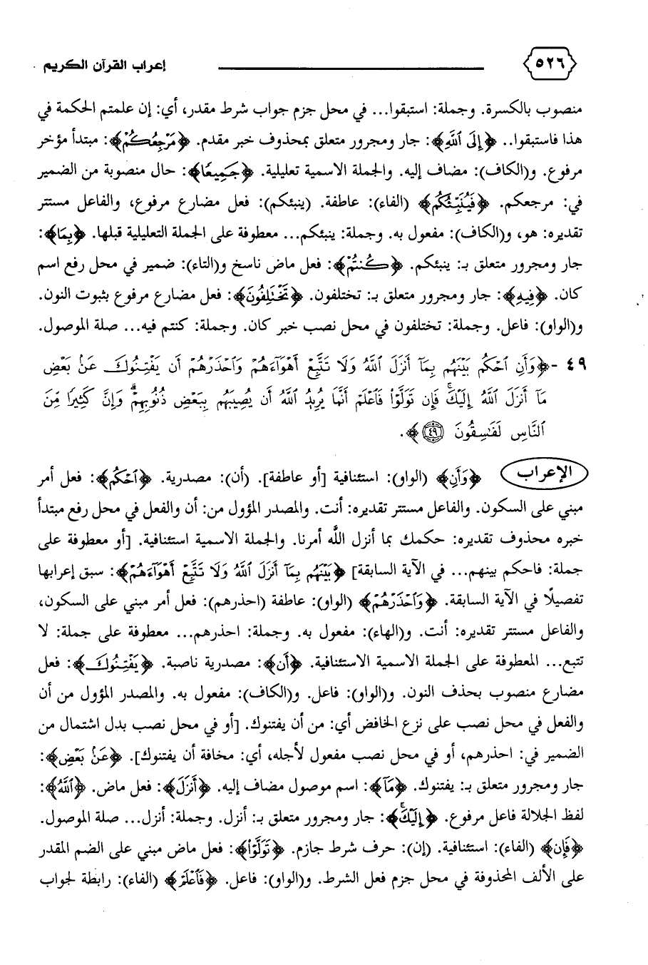 {وَأَنِ} (الواو): استئنافية [أو عاطفة]. (أن): مصدرية. {اُحْكُمْ}: فعل أمر مبني على السكون. والفاعل مستتر تقديره: أنت. والمصدر المؤول من: أن والفعل في محل رفع مبتدأ خبره محذوف تقديره: حكمك بما أنزل الله أمرنا. والجملة الاسمية استئنافية. [أو معطوفة على جملة: فاحكم بينهم ... في الآية السابقة] {بَيْنَهُمْ بِما أَنْزَلَ اللهُ وَلا تَتَّبِعْ أَهْواءَهُمْ}: سبق إعرابها تفصيلا في الآية السابقة. {وَاحْذَرْهُمْ} (الواو): عاطفة (احذرهم): فعل أمر مبني على السكون، والفاعل مستتر تقديره: أنت. و (الهاء): مفعول به. وجملة: احذرهم ... معطوفة على جملة: لا تتبع ... المعطوفة على الجملة الاسمية الاستئنافية. {أَنِ}: مصدرية ناصبة. {يَفْتِنُوكَ}: فعل مضارع منصوب بحذف النون. و (الواو): فاعل. و (الكاف): مفعول به. والمصدر المؤول من أن والفعل في محل نصب على نزع الخافض أي: من أن يفتنوك. [أو في محل نصب بدل اشتمال من الضمير في: احذرهم، أو في محل نصب مفعول لأجله، أي: مخافة أن يفتنوك]. {عَنْ بَعْضِ}: