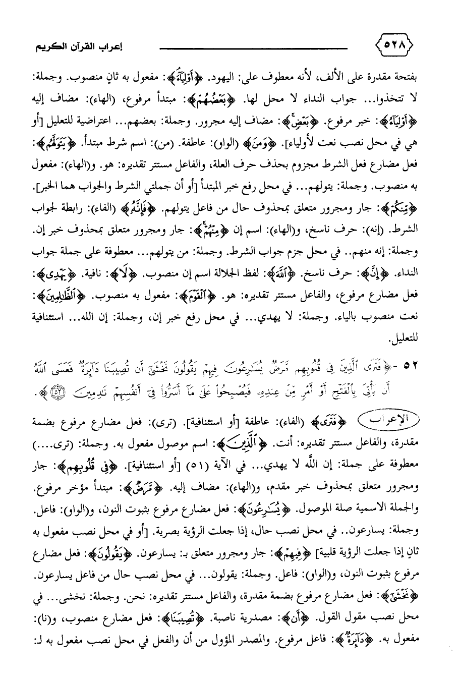 {فَتَرَى} (الفاء): عاطفة [أو استئنافية]. (ترى): فعل مضارع مرفوع بضمة مقدرة، والفاعل مستتر تقديره: أنت. {الَّذِينَ}: اسم موصول مفعول به. وجملة: (ترى ... ) معطوفة على جملة: إن الله لا يهدي ... في الآية (٥١) [أو استئنافية]. {فِي قُلُوبِهِمْ}: جار ومجرور متعلق بمحذوف خبر مقدم، و (الهاء): مضاف إليه. {مَرَضٌ}: مبتدأ مؤخر مرفوع.