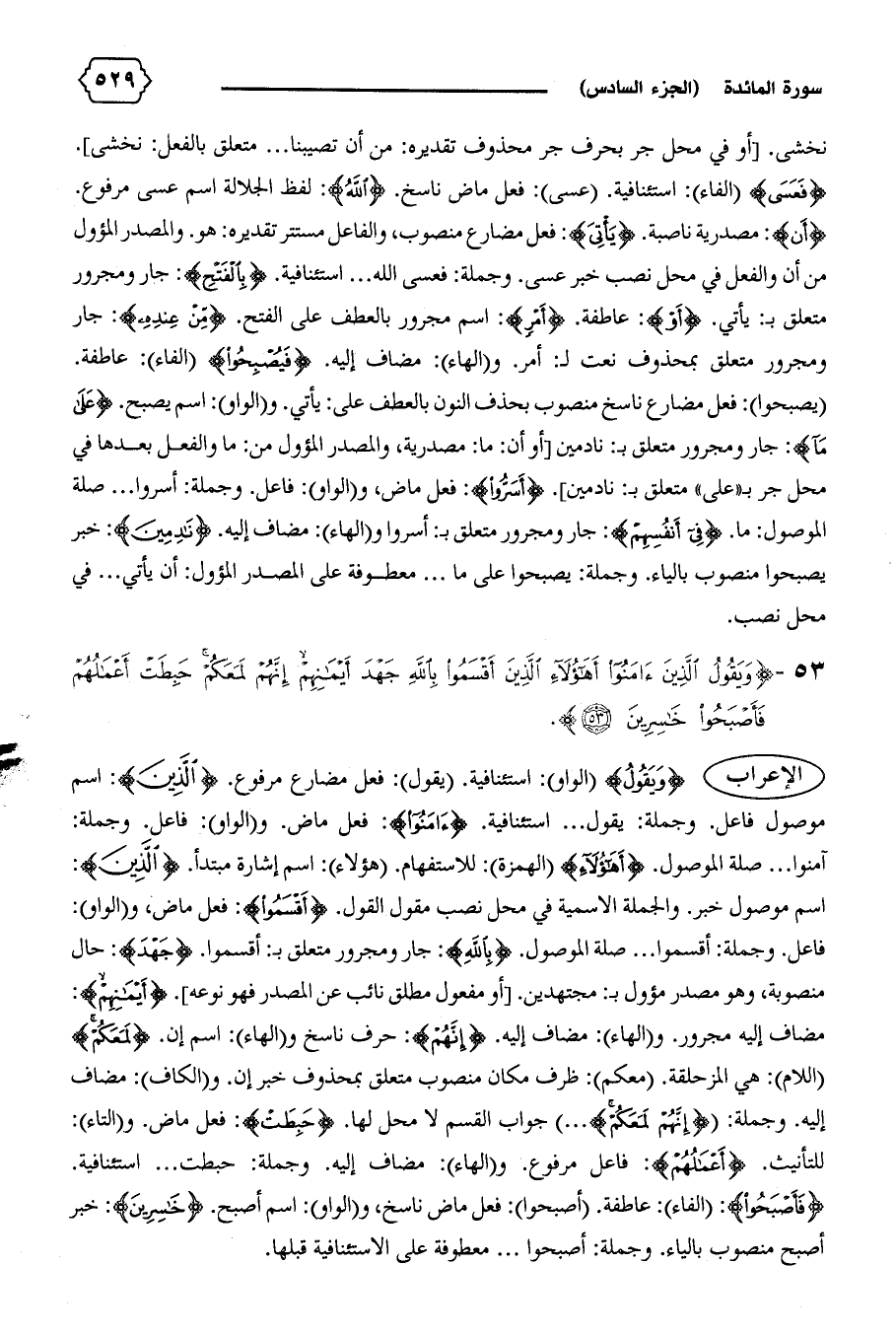 (يصبحوا): فعل مضارع ناسخ منصوب بحذف النون بالعطف على: يأتي. و (الواو): اسم يصبح. {عَلى ما}: جار ومجرور متعلق ب: نادمين [أو أن: ما: مصدرية، والمصدر المؤول من: ما والفعل بعدها في محل جر ب «على» متعلق ب: نادمين]. {أَسَرُّوا}: فعل ماض، و (الواو): فاعل. وجملة: أسروا ... صلة الموصول: ما. {فِي أَنْفُسِهِمْ}: جار ومجرور متعلق ب: أسروا و (الهاء): مضاف إليه. {نادِمِينَ}: خبر يصبحوا منصوب بالياء. وجملة: يصبحوا على ما ... معطوفة على المصدر المؤول: أن يأتي ... في محل نصب.