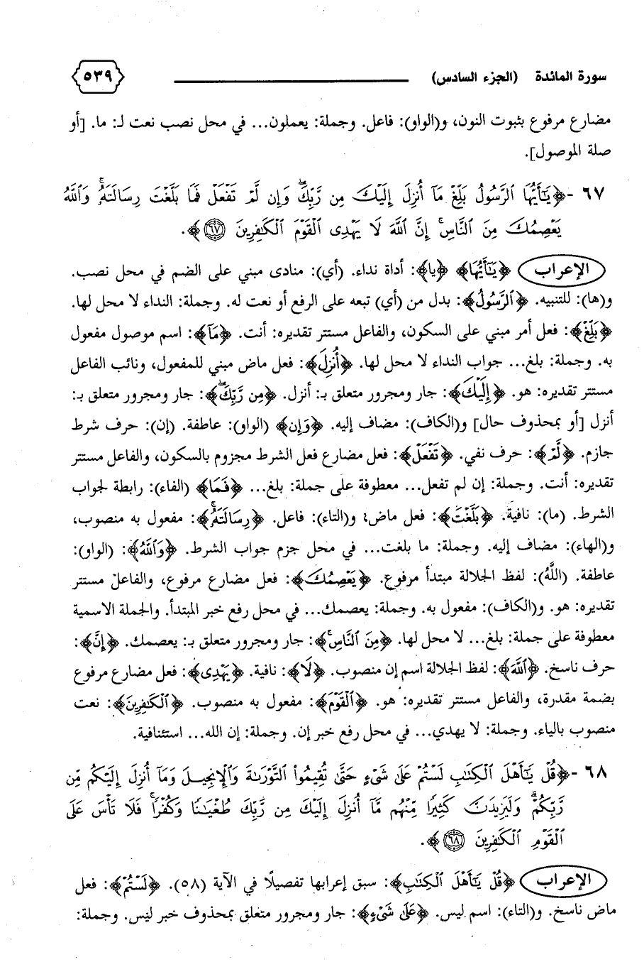 أنزل [أو بمحذوف حال] و (الكاف): مضاف إليه. {وَإِنْ} (الواو): عاطفة. (إن): حرف شرط جازم. {لَمْ}: حرف نفي. {تَفْعَلْ}: فعل مضارع فعل الشرط مجزوم بالسكون، والفاعل مستتر تقديره: أنت. وجملة: إن لم تفعل ... معطوفة على جملة: بلغ ... {فَما} (الفاء): رابطة لجواب الشرط. (ما): نافية. {بَلَّغْتَ}: فعل ماض، و (التاء): فاعل. {رِسالَتَهُ}: مفعول به منصوب، و (الهاء): مضاف إليه. وجملة: ما بلغت ... في محل جزم جواب الشرط. {وَاللهُ}: (الواو):