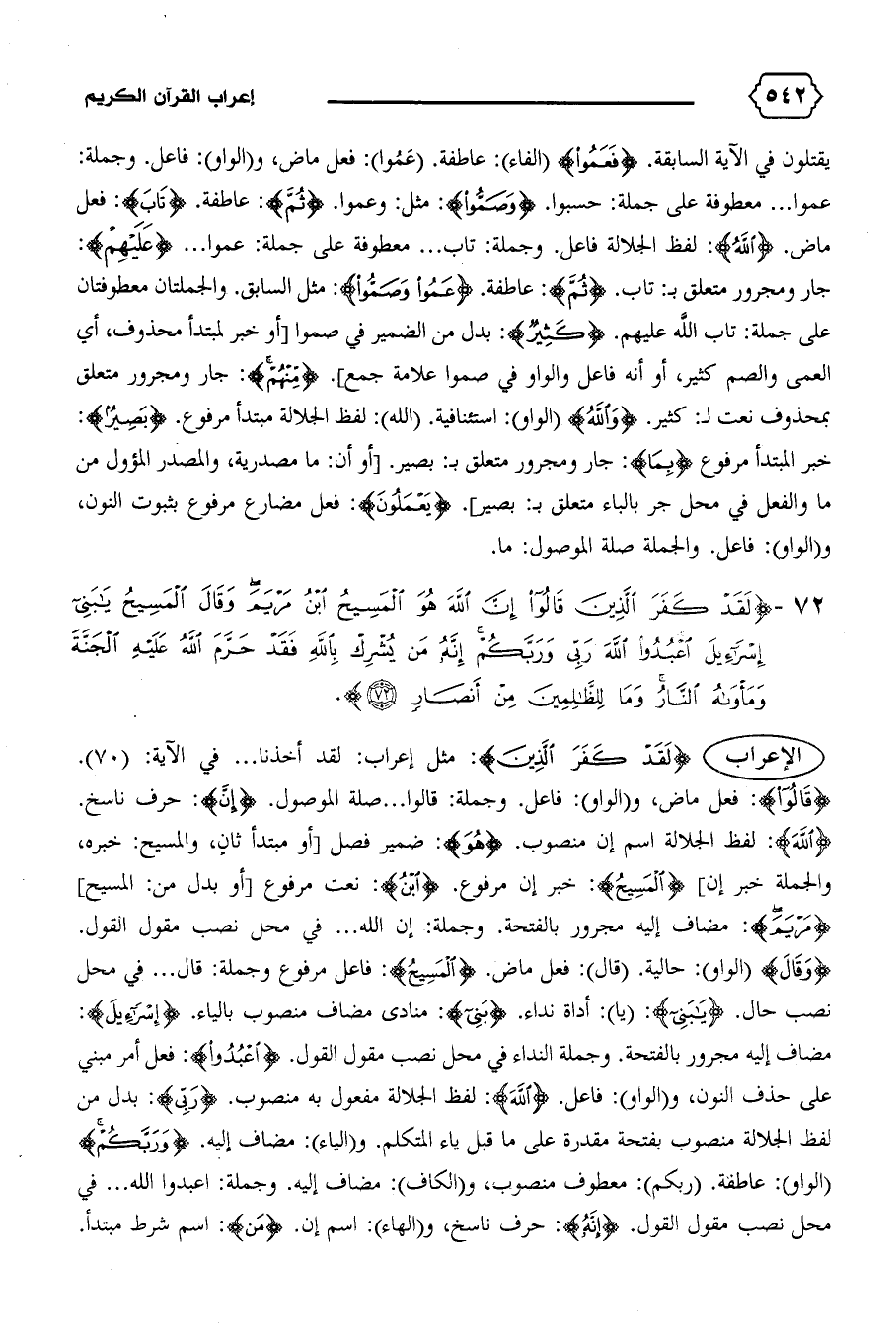 جار ومجرور متعلق ب: تاب. {ثُمَّ}: عاطفة. {عَمُوا وَصَمُّوا}: مثل السابق. والجملتان معطوفتان على جملة: تاب الله عليهم. {كَثِيرٌ}: بدل من الضمير في صموا [أو خبر لمبتدإ محذوف، أي العمى والصم كثير، أو أنه فاعل والواو في صموا علامة جمع]. {مِنْهُمْ}: جار ومجرور متعلق بمحذوف نعت ل: كثير. {وَاللهُ} (الواو): استئنافية. (الله): لفظ الجلالة مبتدأ مرفوع. {بَصِيرٌ}: