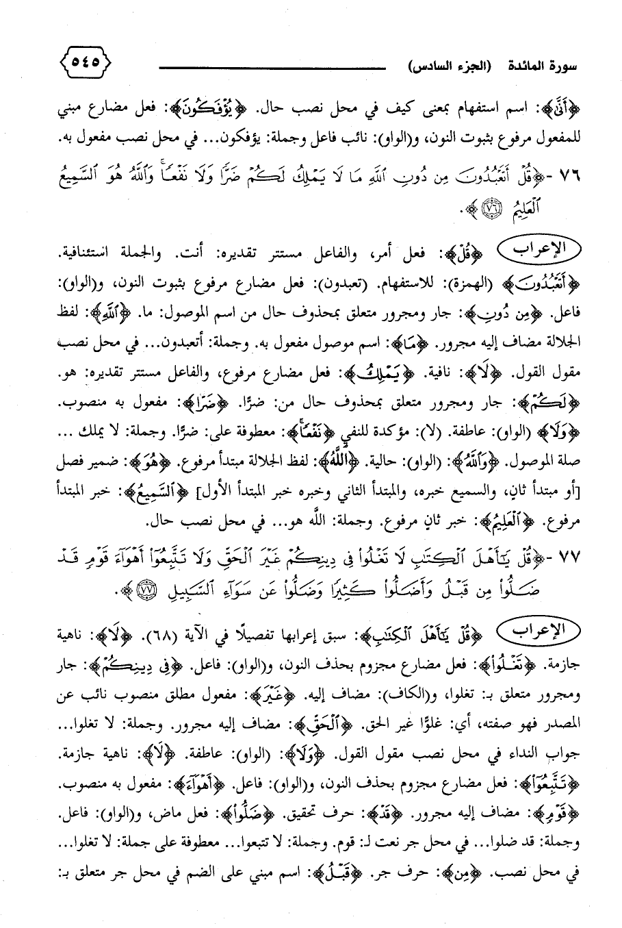 {قُلْ يا أَهْلَ الْكِتابِ}: سبق إعرابها تفصيلا في الآية (٦٨). {لا}: ناهية جازمة. {تَغْلُوا}: فعل مضارع مجزوم بحذف النون، و (الواو): فاعل. {فِي دِينِكُمْ}: جار ومجرور متعلق ب: تغلوا، و (الكاف): مضاف إليه. {غَيْرَ}: مفعول مطلق منصوب نائب عن المصدر فهو صفته، أي: غلوّا غير الحق. {الْحَقِّ}: مضاف إليه مجرور. وجملة: لا تغلوا