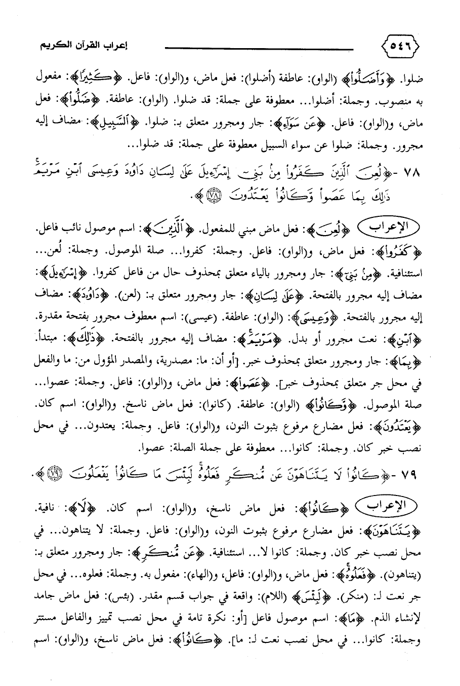 (يتناهون). {فَعَلُوهُ}: فعل ماض، و (الواو): فاعل، و (الهاء): مفعول به. وجملة: فعلوه ... في محل جر نعت ل: (منكر). {لَبِئْسَ} (اللام): واقعة في جواب قسم مقدر. (بئس): فعل ماض جامد لإنشاء الذم. {ما}: اسم موصول فاعل [أو: نكرة تامة في محل نصب تمييز والفاعل مستتر وجملة: كانوا ... في محل نصب نعت ل: ما]. {كانُوا}: فعل ماض ناسخ، و (الواو): اسم