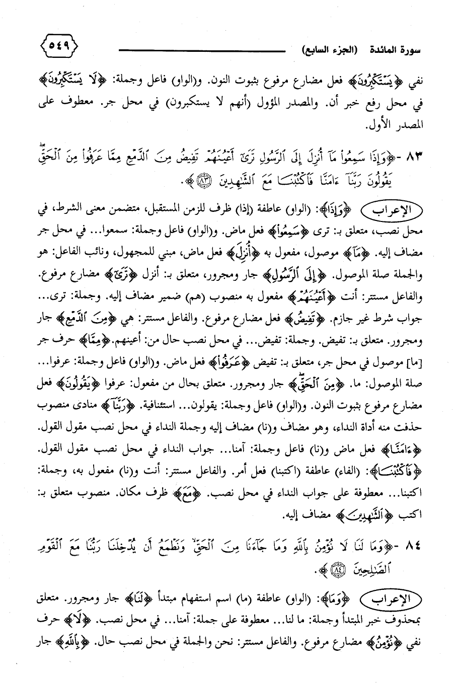 ٨٣ - {وَإِذا سَمِعُوا ما أُنْزِلَ إِلَى الرَّسُولِ تَرى أَعْيُنَهُمْ تَفِيضُ مِنَ الدَّمْعِ مِمّا عَرَفُوا مِنَ الْحَقِّ يَقُولُونَ رَبَّنا آمَنّا فَاكْتُبْنا مَعَ الشّاهِدِينَ (٨٣)}