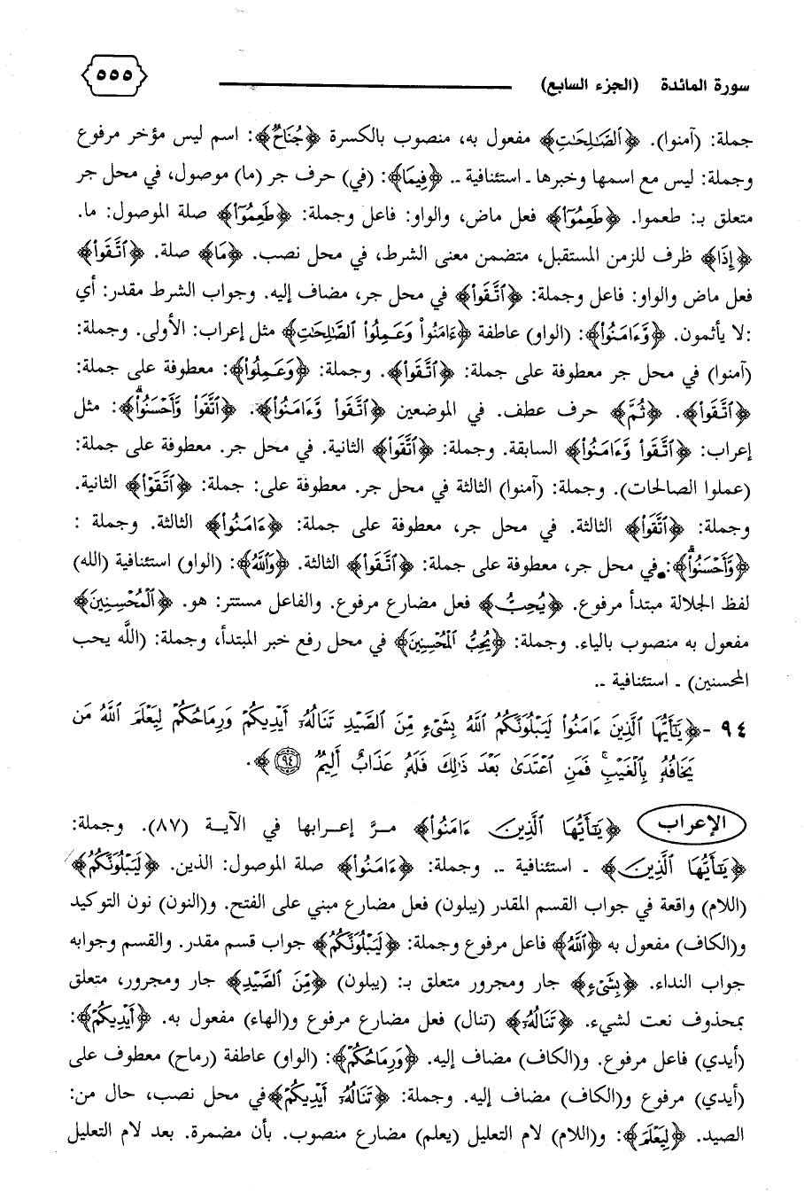 {يا أَيُّهَا الَّذِينَ} -استئنافية-.وجملة: {آمَنُوا} صلة الموصول: الذين. {لَيَبْلُوَنَّكُمُ} (اللام) واقعة في جواب القسم المقدر (يبلون) فعل مضارع مبني على الفتح. و (النون) نون التوكيد و (الكاف) مفعول به {اللهُ} فاعل مرفوع وجملة: {لَيَبْلُوَنَّكُمُ} جواب قسم مقدر. والقسم وجوابه جواب النداء. {بِشَيْءٍ} جار ومجرور متعلق ب: (يبلون) {مِنَ الصَّيْدِ} جار ومجرور، متعلق بمحذوف نعت لشيء. {تَنالُهُ} (تنال) فعل مضارع مرفوع و (الهاء) مفعول به. {أَيْدِيكُمْ}: