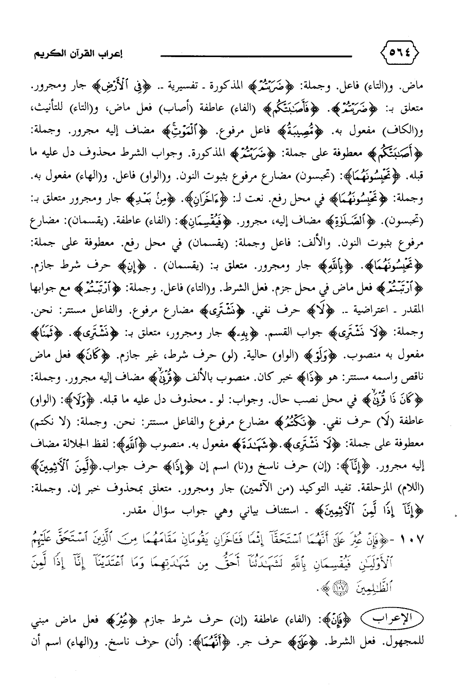 (أصابتكم) معطوفة على جملة: {ضَرَبْتُمْ} المذكورة. وجواب الشرط محذوف دل عليه ما قبله. {تَحْبِسُونَهُما}: (تحبسون) مضارع مرفوع بثبوت النون. و (الواو) فاعل. و (الهاء) مفعول به.
