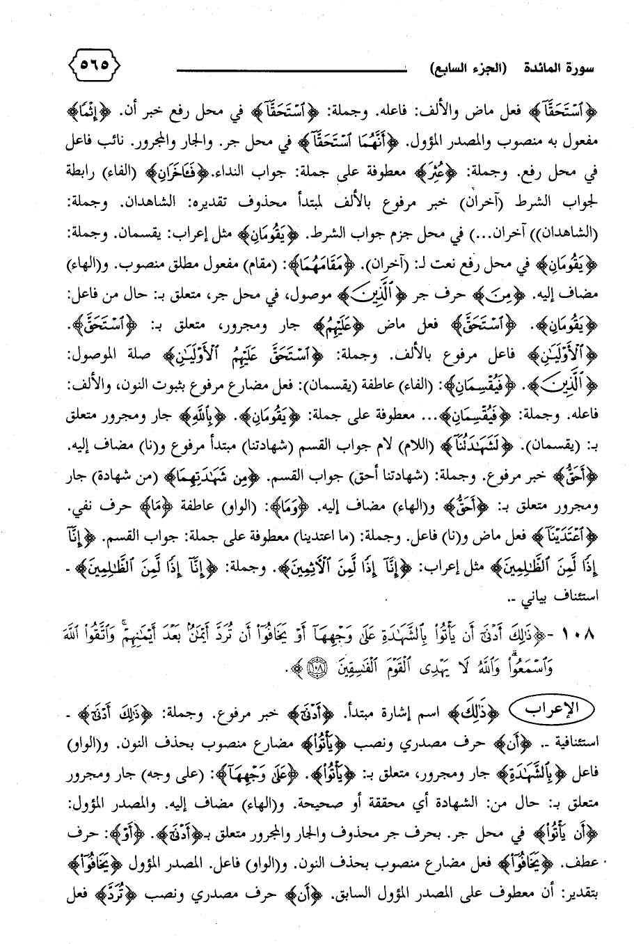 {اِسْتَحَقّا} فعل ماض والألف: فاعله. وجملة: {اِسْتَحَقّا} في محل رفع خبر أن. {إِثْماً} مفعول به منصوب والمصدر المؤول. {أَنَّهُمَا اسْتَحَقّا} في محل جر. والجار والمجرور. نائب فاعل في محل رفع. وجملة: {عُثِرَ} معطوفة على جملة: جواب النداء. {فَآخَرانِ} (الفاء) رابطة لجواب الشرط (آخران) خبر مرفوع بالألف لمبتدإ محذوف تقديره: الشاهدان. وجملة: