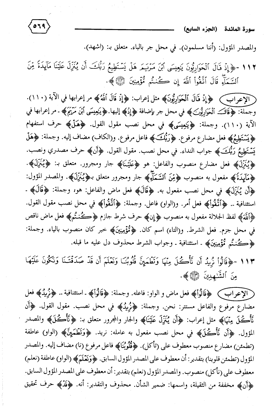 وجملة: {قالَ الْحَوارِيُّونَ} في محل جر بإضافة {إِذْ} إليها. {يا عِيسَى ابْنَ مَرْيَمَ} -مر إعرابها في الآية (١١٠).وجملة: {يا عِيسَى} في محل نصب مقول القول. {هَلْ} حرف استفهام {يَسْتَطِيعُ} فعل مضارع مرفوع. {رَبُّكَ} فاعل مرفوع. و (الكاف) مضاف إليه. وجملة: {هَلْ يَسْتَطِيعُ رَبُّكَ} جواب النداء. في محل نصب. مقول القول. {أَنْ} حرف مصدري ونصب.