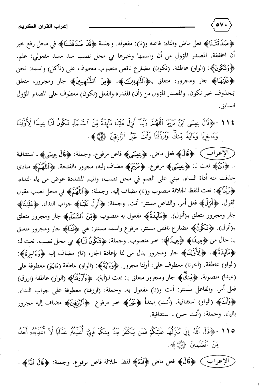 {رَبَّنا}: نعت للفظ الجلالة منصوب و (نا) مضاف إليه. وجملة: {اللهُمَّ} في محل نصب مقول القول. {أَنْزِلْ} فعل أمر. والفاعل مستتر: أنت. وجملة: {أَنْزِلْ عَلَيْنا} جواب النداء. {عَلَيْنا} جار ومجرور متعلق ب (أنزل). {مائِدَةً} مفعول به منصوب {مِنَ السَّماءِ} جار ومجرور متعلق ب (أنزل). {تَكُونُ} مضارع ناقص مستتر. مرفوع واسمه مستتر: هي {لَنا} جار ومجرور متعلق ب: حال من {عِيداً} {عِيداً}: خبر منصوب. وجملة: {تَكُونُ لَنا} في محل نصب. نعت ل: