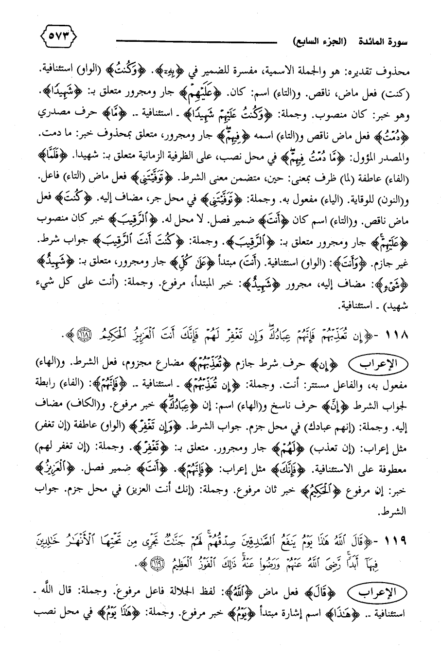 {إِنْ} حرف شرط جازم {تُعَذِّبْهُمْ} مضارع مجزوم، فعل الشرط. و (الهاء) مفعول به، والفاعل مستتر: أنت. وجملة: {إِنْ تُعَذِّبْهُمْ} -استئنافية-. {فَإِنَّهُمْ}: (الفاء) رابطة لجواب الشرط {إِنْ} حرف ناسخ و (الهاء) اسم: إن {عِبادُكَ} خبر مرفوع. و (الكاف) مضاف إليه. وجملة: (إنهم عبادك) في محل جزم. جواب الشرط. {وَإِنْ تَغْفِرْ} (الواو) عاطفة (إن تغفر) مثل إعراب: (إن تعذب) {لَهُمْ} جار ومجرور. متعلق ب: {تَغْفِرْ}. وجملة: (إن تغفر لهم) معطوفة على الاستئنافية. {فَإِنَّكَ} مثل إعراب: {فَإِنَّهُمْ}. {أَنْتَ} ضمير فصل. {الْعَزِيزُ} خبر: إن مرفوع {الْحَكِيمُ} خبر ثان مرفوع. وجملة: (إنك أنت العزيز) في محل جزم. جواب الشرط.
