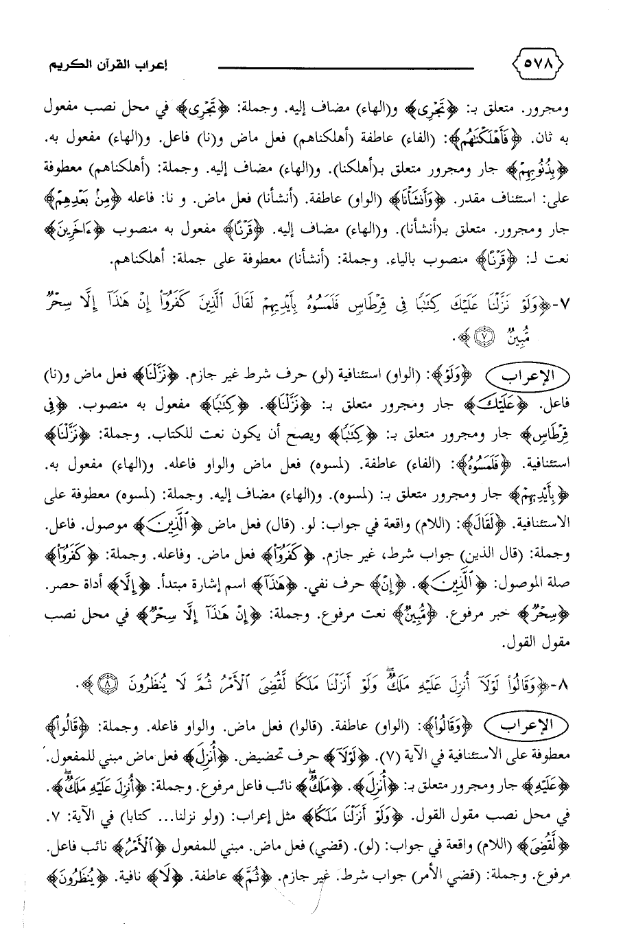 {وَلَوْ}: (الواو) استئنافية (لو) حرف شرط غير جازم. {نَزَّلْنا} فعل ماض و (نا) فاعل. {عَلَيْكَ} جار ومجرور متعلق ب: {نَزَّلْنا}. {كِتاباً} مفعول به منصوب. {فِي قِرْطاسٍ} جار ومجرور متعلق ب: {كِتاباً} ويصح أن يكون نعت للكتاب. وجملة: {نَزَّلْنا} استئنافية. {فَلَمَسُوهُ}: (الفاء) عاطفة. (لمسوه) فعل ماض والواو فاعله. و (الهاء) مفعول به.