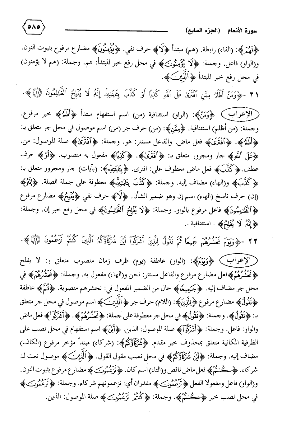 {كَذَّبَ} و (الهاء) مضاف إليه. وجملة: {كَذَّبَ بِآياتِهِ} معطوفة على جملة الصلة. {إِنَّهُ} (إن) حرف ناسخ (الهاء) اسم إن وهو ضمير الشأن. {لا} حرف نفي {يُفْلِحُ} مضارع مرفوع {الظّالِمُونَ} فاعل مرفوع بالواو. وجملة: {لا يُفْلِحُ الظّالِمُونَ} في محل رفع خبر إن. وجملة: