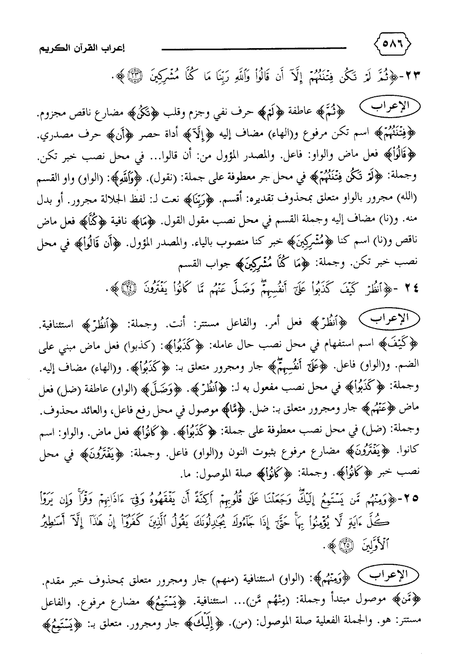 وجملة: {لَمْ تَكُنْ فِتْنَتُهُمْ} في محل جر معطوفة على جملة: (نقول). {وَاللهِ}: (الواو) واو القسم (الله) مجرور بالواو متعلق بمحذوف تقديره: أقسم. {رَبِّنا} نعت ل: لفظ الجلالة مجرور. أو بدل منه. و (نا) مضاف إليه وجملة القسم في محل نصب مقول القول. {ما} نافية {كُنّا} فعل ماض ناقص و (نا) اسم كنا {مُشْرِكِينَ} خبر كنا منصوب بالياء. والمصدر المؤول. {أَنْ قالُوا} في محل نصب خبر تكن. وجملة: {ما كُنّا مُشْرِكِينَ} جواب القسم.