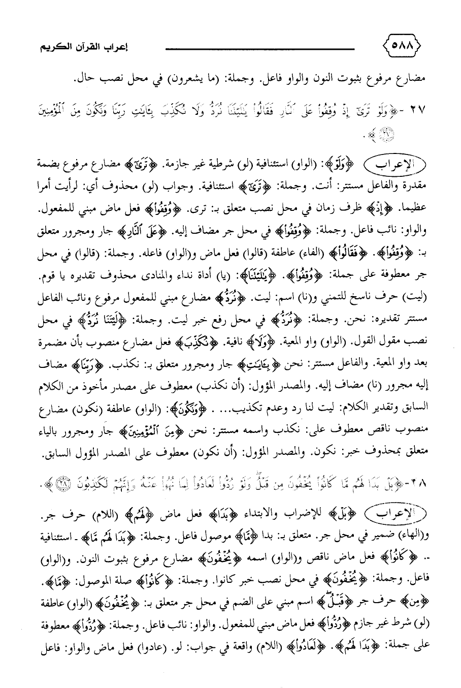(ليت) حرف ناسخ للتمني و (نا) اسم: ليت. {نُرَدُّ} مضارع مبني للمفعول مرفوع ونائب الفاعل مستتر تقديره: نحن. وجملة: {نُرَدُّ} في محل رفع خبر ليت. وجملة: {لَيْتَنا نُرَدُّ} في محل نصب مقول القول. (الواو) واو المعية. {وَلا} نافية. {نُكَذِّبَ} فعل مضارع منصوب بأن مضمرة بعد واو المعية. والفاعل مستتر: نحن {بِآياتِ} جار ومجرور متعلق ب: نكذب. {رَبِّنا} مضاف إليه مجرور (نا) مضاف إليه. والمصدر المؤول: (أن نكذب) معطوف على مصدر مأخوذ من الكلام السابق وتقدير الكلام: ليت لنا رد وعدم تكذيب ... {وَنَكُونَ}: (الواو) عاطفة (نكون) مضارع منصوب ناقص معطوف على: نكذب واسمه مستتر: نحن {مِنَ الْمُؤْمِنِينَ} جار ومجرور بالياء متعلق بمحذوف خبر: نكون. والمصدر المؤول: (أن نكون) معطوف على المصدر المؤول السابق.