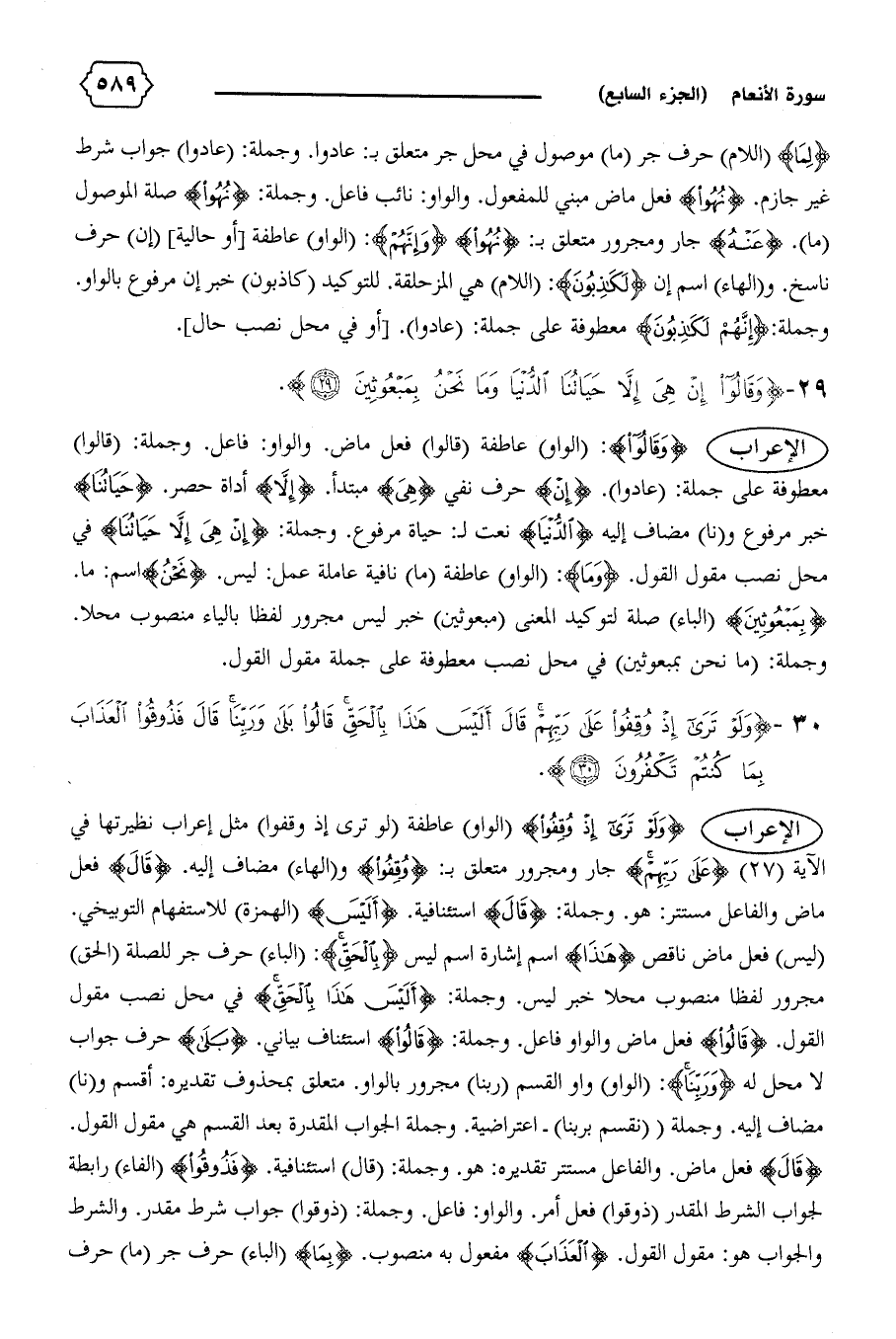 {وَلَوْ تَرى إِذْ وُقِفُوا} (الواو) عاطفة (لو ترى إذ وقفوا) مثل إعراب نظيرتها في الآية (٢٧) {عَلى رَبِّهِمْ} جار ومجرور متعلق ب: {وُقِفُوا} و (الهاء) مضاف إليه. {قالَ} فعل ماض والفاعل مستتر: هو. وجملة: {قالَ} استئنافية. {أَلَيْسَ} (الهمزة) للاستفهام التوبيخي.