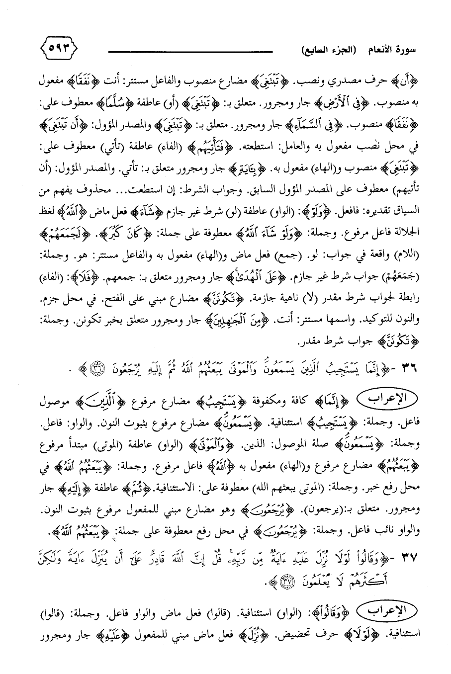 وجملة: {يَسْمَعُونَ} صلة الموصول: الذين. {وَالْمَوْتى} (الواو) عاطفة (الموتى) مبتدأ مرفوع {يَبْعَثُهُمُ} مضارع مرفوع و (الهاء) مفعول به {اللهُ} فاعل مرفوع. وجملة: {يَبْعَثُهُمُ اللهُ} في محل رفع خبر. وجملة: (الموتى يبعثهم الله) معطوفة على: الاستئنافية. {ثُمَّ} عاطفة {إِلَيْهِ} جار ومجرور. متعلق ب: (يرجعون). {يُرْجَعُونَ} وهو مضارع مبني للمفعول مرفوع بثبوت النون.