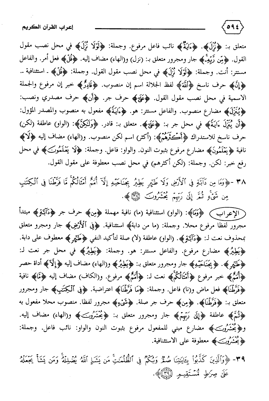 {طائِرٍ}. {بِجَناحَيْهِ} جار ومجرور متعلق ب: {يَطِيرُ} و (الهاء) مضاف إليه {إِلاّ} أداة حصر {أُمَمٌ} خبر مرفوع {أَمْثالُكُمْ} نعت ل: {أُمَمٌ} مرفوع. و (الكاف) مضاف إليه {ما} نافية {فَرَّطْنا} فعل ماض و (نا) فاعل. وجملة: {ما فَرَّطْنا} اعتراضية. {فِي الْكِتابِ} جار ومجرور متعلق ب: {فَرَّطْنا}. {مِنْ} حرف جر صلة. {شَيْءٍ} مجرور لفظا. منصوب محلا مفعول به {ثُمَّ} عاطفة {إِلى رَبِّهِمْ} جار ومجرور متعلق ب: {يُحْشَرُونَ} و (الهاء) مضاف إليه.