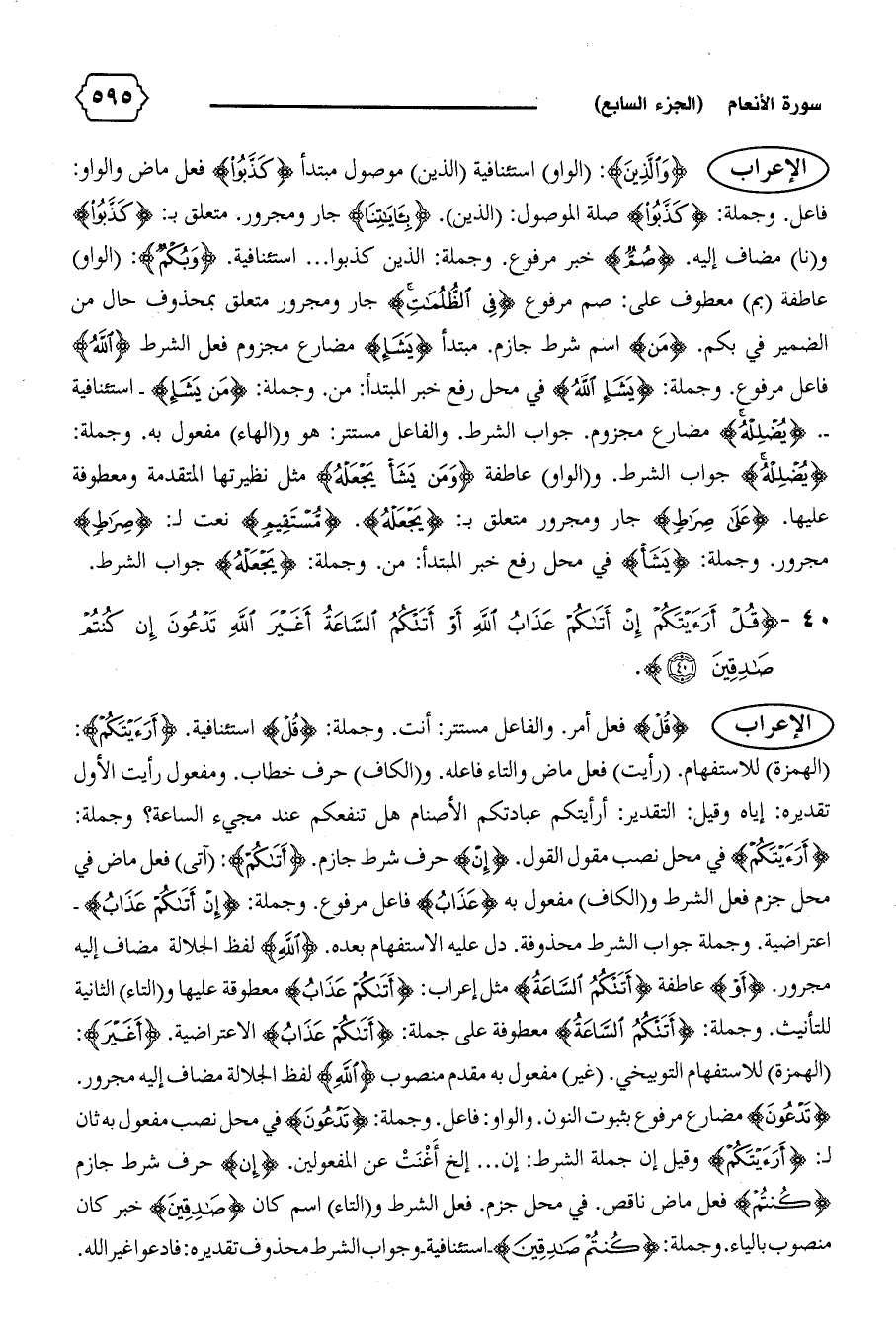 {يُضْلِلْهُ} جواب الشرط. و (الواو) عاطفة {وَمَنْ يَشَأْ يَجْعَلْهُ} مثل نظيرتها المتقدمة ومعطوفة عليها. {عَلى صِراطٍ} جار ومجرور متعلق ب: {يَجْعَلْهُ}. {مُسْتَقِيمٍ} نعت ل: {صِراطٍ} مجرور. وجملة: {يَشَأِ} في محل رفع خبر المبتدأ: من. وجملة: {يَجْعَلْهُ} جواب الشرط.