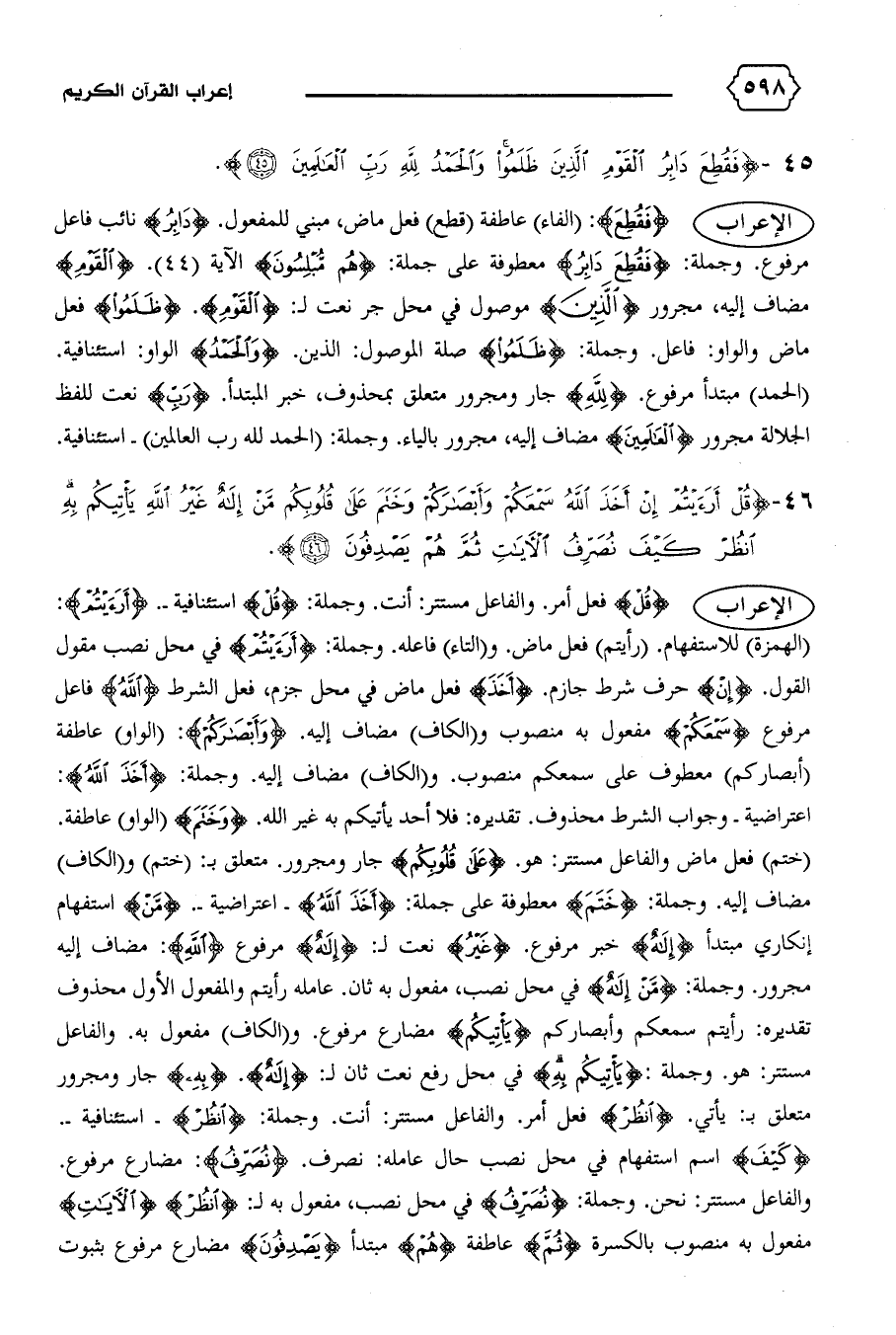 {فَقُطِعَ}: (الفاء) عاطفة (قطع) فعل ماض، مبني للمفعول. {دابِرُ} نائب فاعل مرفوع. وجملة: {فَقُطِعَ دابِرُ} معطوفة على جملة: {هُمْ مُبْلِسُونَ} الآية (٤٤). {الْقَوْمِ} مضاف إليه، مجرور {الَّذِينَ} موصول في محل جر نعت ل: {الْقَوْمِ}. {ظَلَمُوا} فعل ماض والواو: فاعل. وجملة: {ظَلَمُوا} صلة الموصول: الذين. {وَالْحَمْدُ} الواو: استئنافية.