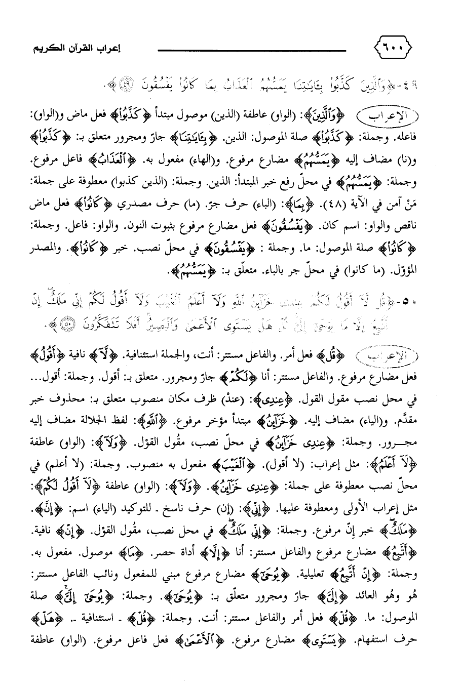 فاعله. وجملة: {كَذَّبُوا} صلة الموصول: الذين. {بِآياتِنا} جارّ ومجرور متعلق ب: {كَذَّبُوا} و (نا) مضاف إليه {يَمَسُّهُمُ} مضارع مرفوع. و (الهاء) مفعول به. {الْعَذابُ} فاعل مرفوع.