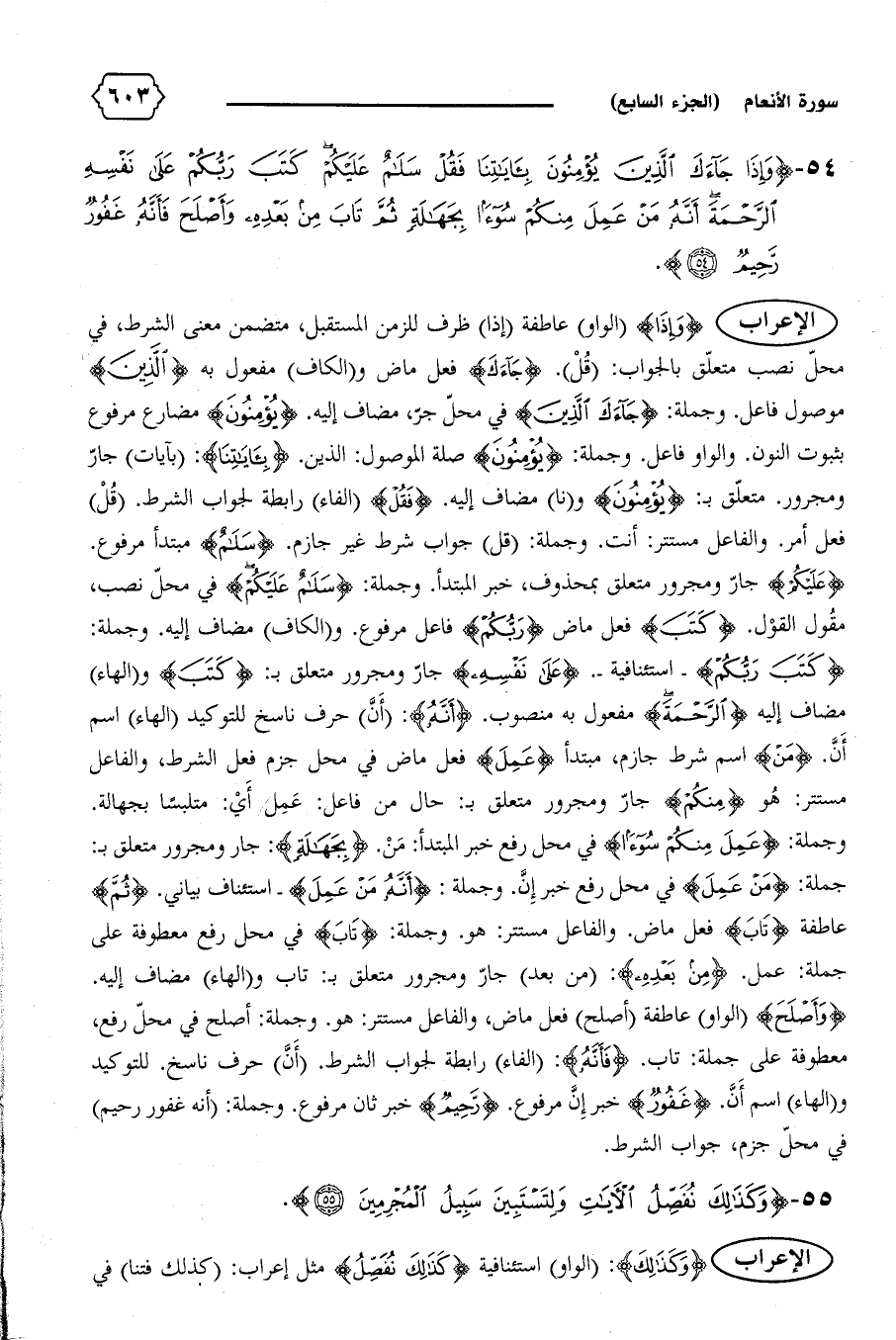 ٥٤ - {وَإِذا جاءَكَ الَّذِينَ يُؤْمِنُونَ بِآياتِنا فَقُلْ سَلامٌ عَلَيْكُمْ كَتَبَ رَبُّكُمْ عَلى نَفْسِهِ الرَّحْمَةَ أَنَّهُ مَنْ عَمِلَ مِنْكُمْ سُوءاً بِجَهالَةٍ ثُمَّ تابَ مِنْ بَعْدِهِ وَأَصْلَحَ فَأَنَّهُ غَفُورٌ رَحِيمٌ (٥٤)}