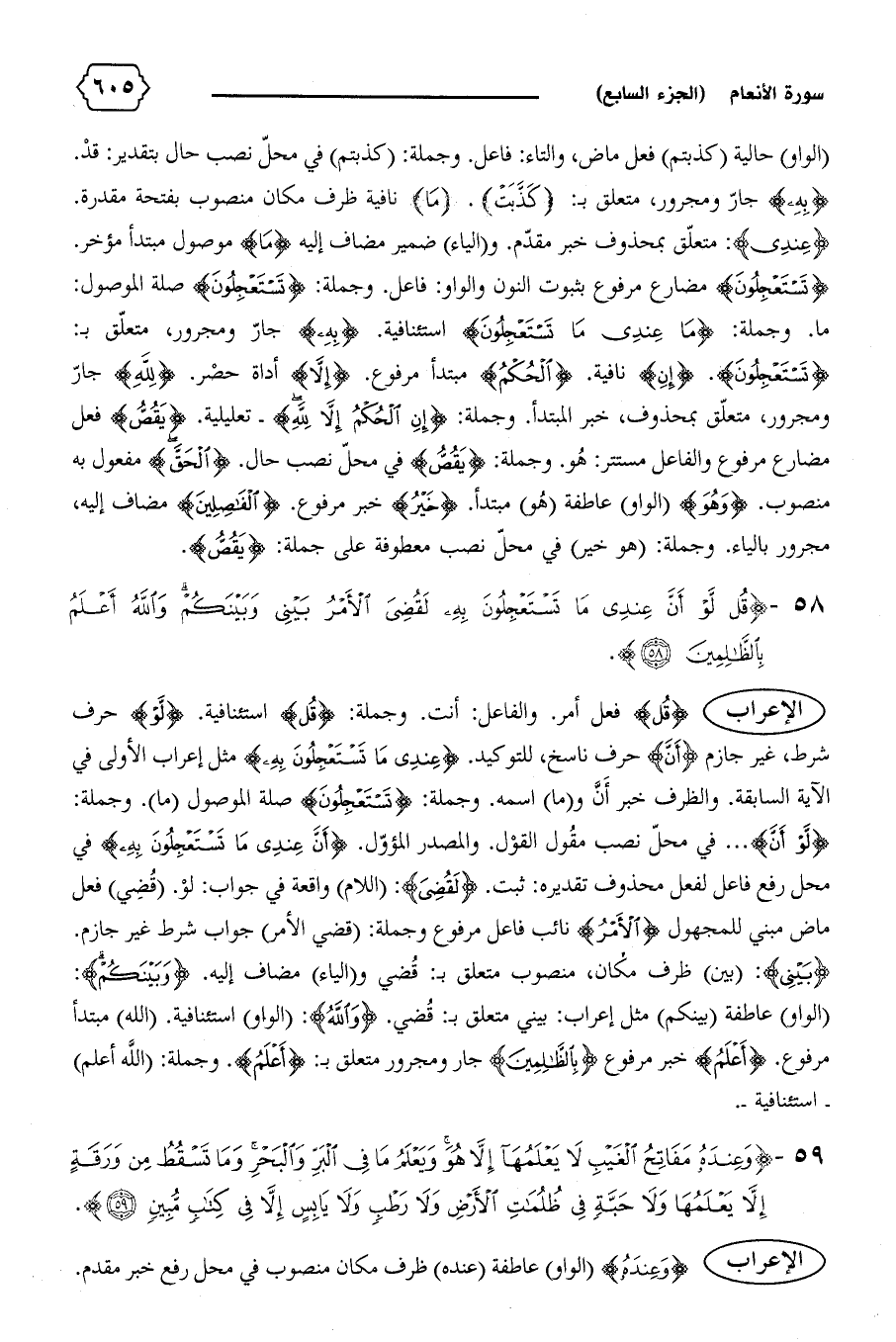 {تَسْتَعْجِلُونَ}. {إِنِ} نافية. {الْحُكْمُ} مبتدأ مرفوع. {إِلاّ} أداة حصر. {لِلّهِ} جارّ ومجرور، متعلّق بمحذوف، خبر المبتدأ. وجملة: {إِنِ الْحُكْمُ إِلاّ لِلّهِ} -تعليلية. {يَقُصُّ} فعل مضارع مرفوع والفاعل مستتر: هو. وجملة: {يَقُصُّ} في محلّ نصب حال. {الْحَقَّ} مفعول به منصوب. {وَهُوَ} (الواو) عاطفة (هو) مبتدأ. {خَيْرُ} خبر مرفوع. {الْفاصِلِينَ} مضاف إليه، مجرور بالياء. وجملة: (هو خير) في محلّ نصب معطوفة على جملة: {يَقُصُّ}.
