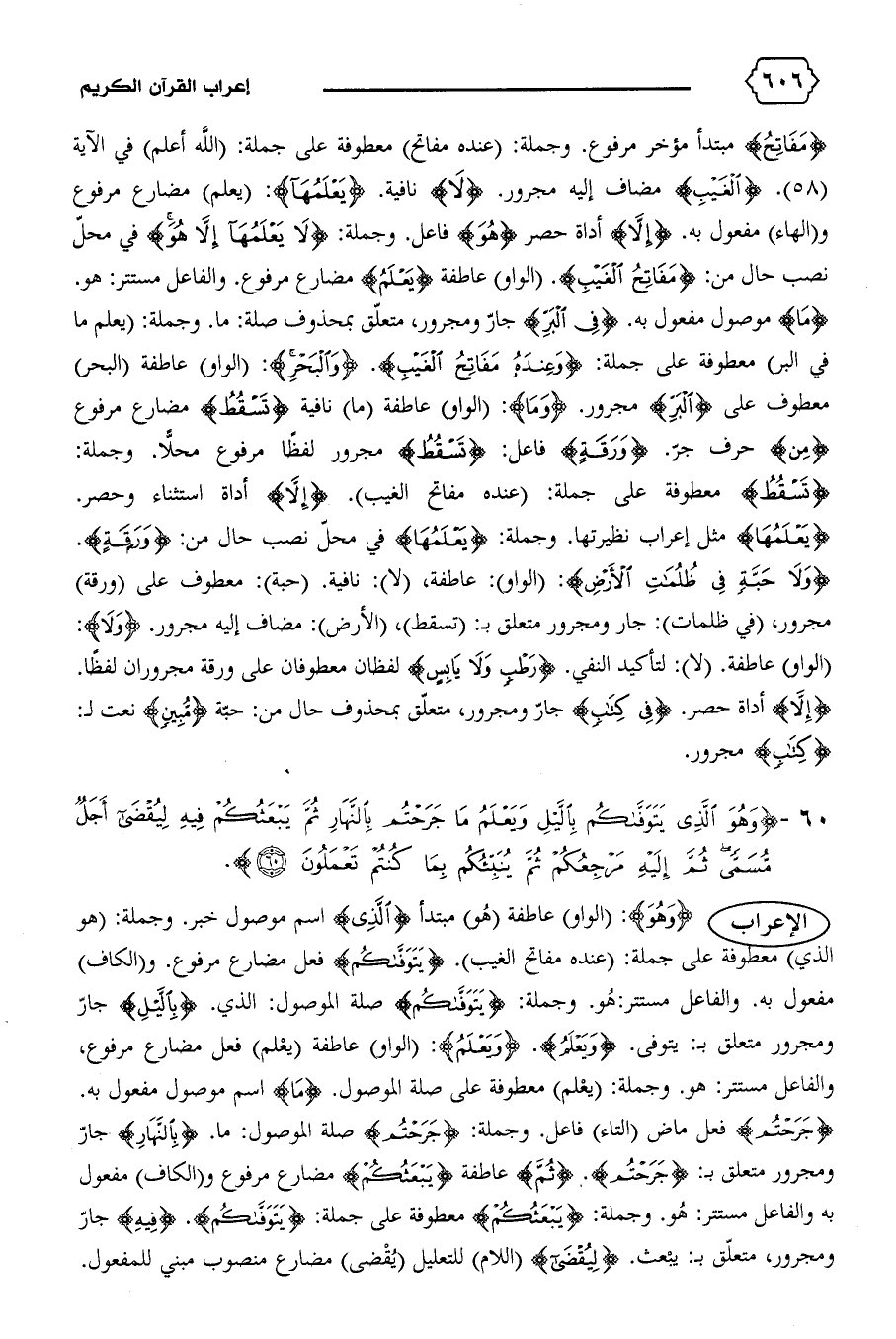 {جَرَحْتُمْ} فعل ماض (التاء) فاعل. وجملة: {جَرَحْتُمْ} صلة الموصول: ما. {بِالنَّهارِ} جارّ ومجرور متعلق ب: {جَرَحْتُمْ}. {ثُمَّ} عاطفة {يَبْعَثُكُمْ} مضارع مرفوع و (الكاف) مفعول به والفاعل مستتر: هو. وجملة: {يَبْعَثُكُمْ} معطوفة على جملة: {يَتَوَفّاكُمْ}. {فِيهِ} جارّ ومجرور، متعلّق ب: يبعث. {لِيُقْضى} (اللام) للتعليل (يقضى) مضارع منصوب مبني للمفعول.