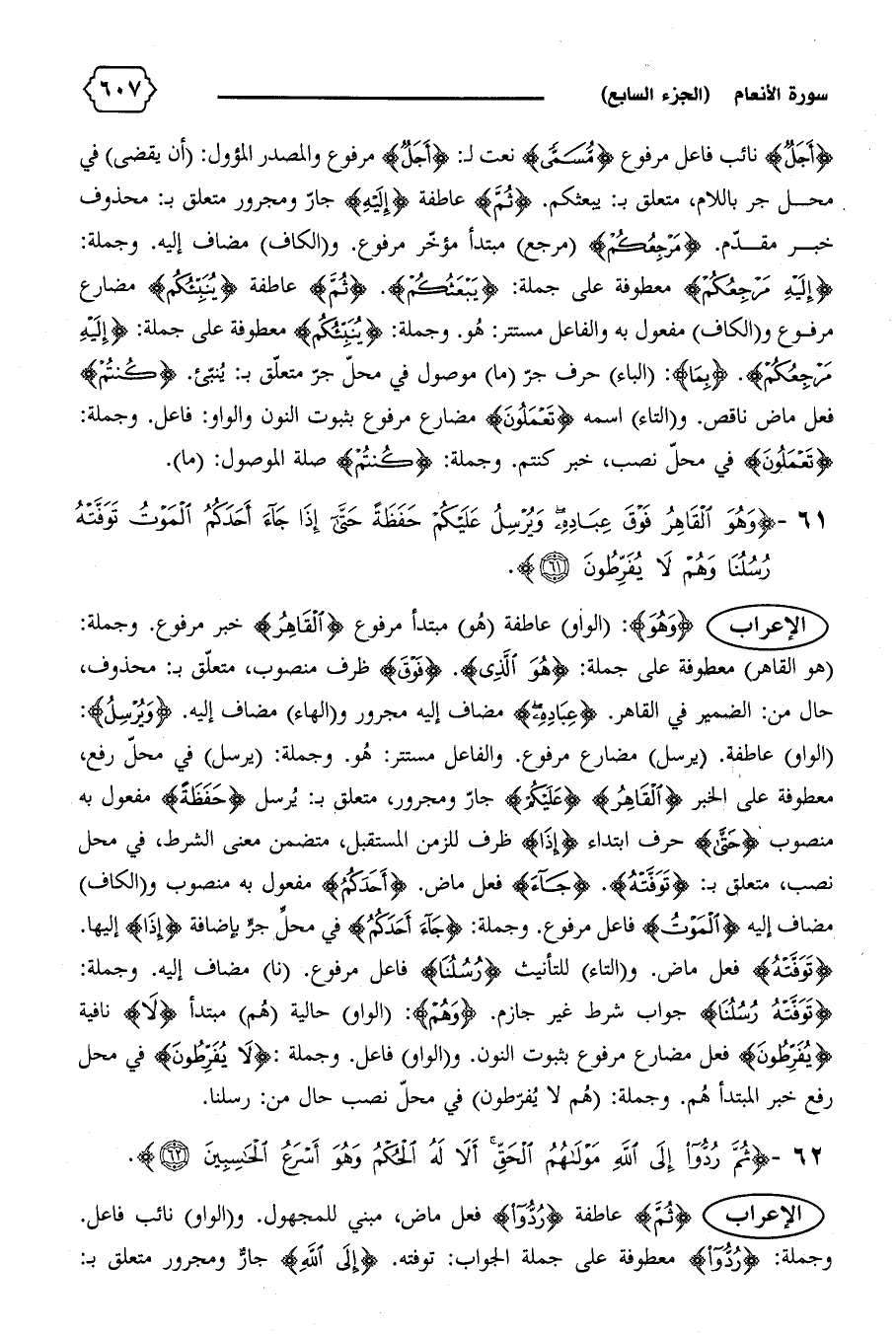 (هو القاهر) معطوفة على جملة: {هُوَ الَّذِي}. {فَوْقَ} ظرف منصوب، متعلّق ب: محذوف، حال من: الضمير في القاهر. {عِبادِهِ} مضاف إليه مجرور و (الهاء) مضاف إليه. {وَيُرْسِلُ}: