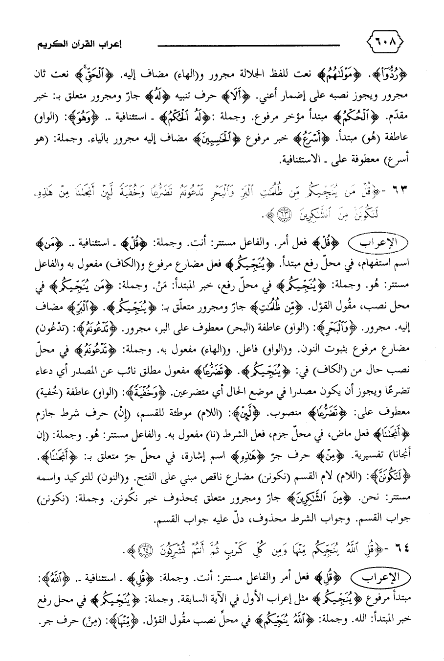 {قُلْ} فعل أمر. والفاعل مستتر: أنت. وجملة: {قُلْ} -استئنافية-. {مَنْ} اسم استفهام، في محلّ رفع مبتدأ. {يُنَجِّيكُمْ} فعل مضارع مرفوع و (الكاف) مفعول به والفاعل مستتر: هو. وجملة: {يُنَجِّيكُمْ} في محلّ رفع، خبر المبتدأ: من. وجملة: {مَنْ يُنَجِّيكُمْ} في محل نصب، مقول القول. {مِنْ ظُلُماتِ} جارّ ومجرور متعلّق ب: {يُنَجِّيكُمْ}. {الْبَرِّ} مضاف إليه. مجرور. {وَالْبَحْرِ}: (الواو) عاطفة (البحر) معطوف على البر، مجرور. {تَدْعُونَهُ}: (تدعون) مضارع مرفوع بثبوت النون. و (الواو) فاعل. و (الهاء) مفعول به. وجملة: {تَدْعُونَهُ} في محلّ نصب حال من (الكاف) في: {يُنَجِّيكُمْ}. {تَضَرُّعاً} مفعول مطلق نائب عن المصدر أي دعاء تضرعا ويجوز أن يكون مصدرا في موضع الحال أي متضرعين. {وَخُفْيَةً}: (الواو) عاطفة (خفية) معطوف على: {تَضَرُّعاً} منصوب. {لَئِنْ}: (اللام) موطئة للقسم، (إن) حرف شرط جازم {أَنْجانا} فعل ماض، في محلّ جزم، فعل الشرط (نا) مفعول به. والفاعل مستتر: هو. وجملة: (إن أنجانا) تفسيرية. {مَنْ} حرف جرّ {هذِهِ} اسم إشارة، في محلّ جرّ متعلق ب: {أَنْجانا}.