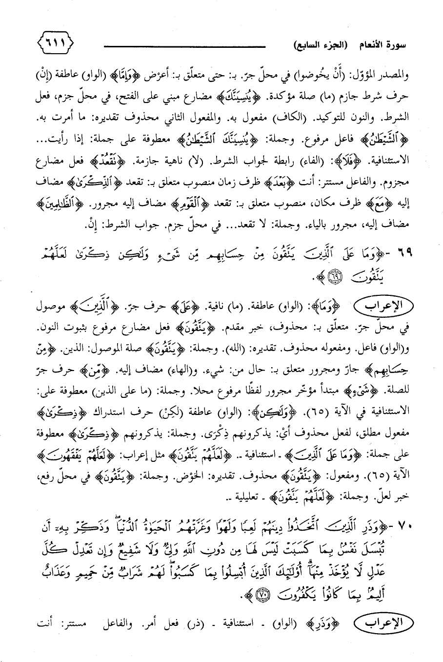 الاستئنافية في الآية (٦٥). {وَلكِنْ}: (الواو) عاطفة (لكن) حرف استدراك {ذِكْرى} مفعول مطلق، لفعل محذوف أي: يذكرونهم ذكرى. وجملة: يذكرونهم {ذِكْرى} معطوفة على جملة: {وَما عَلَى الَّذِينَ} -استئنافية-. {لَعَلَّهُمْ يَتَّقُونَ} مثل إعراب: {لَعَلَّهُمْ يَفْقَهُونَ} الآية (٦٥).ومفعول: {يَتَّقُونَ} محذوف. تقديره: الخوض. وجملة: {يَتَّقُونَ} في محلّ رفع، خبر لعلّ. وجملة: {لَعَلَّهُمْ يَتَّقُونَ} -تعليلية-.