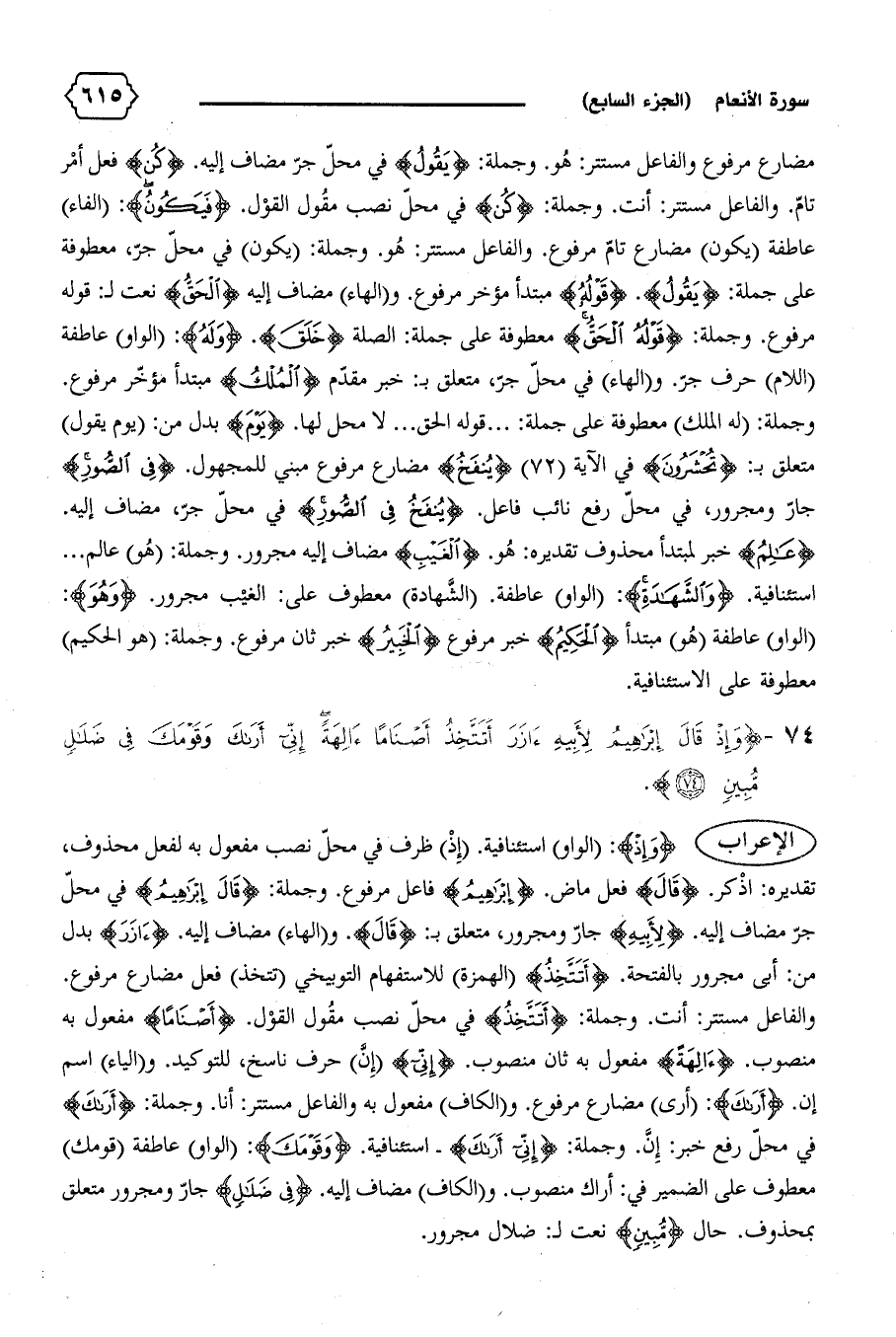 والفاعل مستتر: أنت. وجملة: {أَتَتَّخِذُ} في محلّ نصب مقول القول. {أَصْناماً} مفعول به منصوب. {آلِهَةً} مفعول به ثان منصوب. {إِنِّي} (إنّ) حرف ناسخ، للتوكيد. و (الياء) اسم إن. {أَراكَ}: (أرى) مضارع مرفوع. و (الكاف) مفعول به والفاعل مستتر: أنا. وجملة: {أَراكَ} في محلّ رفع خبر: إنّ. وجملة: {إِنِّي أَراكَ} -استئنافية. {وَقَوْمَكَ}: (الواو) عاطفة (قومك) معطوف على الضمير في: أراك منصوب. و (الكاف) مضاف إليه. {فِي ضَلالٍ} جارّ ومجرور متعلق بمحذوف. حال {مُبِينٍ} نعت ل: ضلال مجرور.
