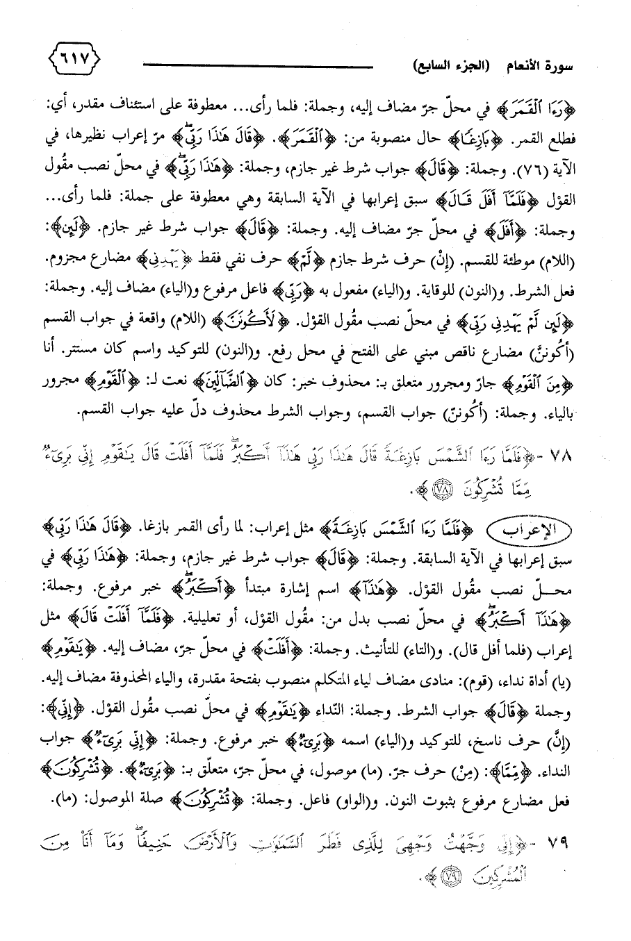 فطلع القمر. {بازِغاً} حال منصوبة من: {الْقَمَرَ}. {قالَ هذا رَبِّي} مرّ إعراب نظيرها، في الآية (٧٦).وجملة: {قالَ} جواب شرط غير جازم، وجملة: {هذا رَبِّي} في محلّ نصب مقول القول {فَلَمّا أَفَلَ قالَ} سبق إعرابها في الآية السابقة وهي معطوفة على جملة: فلما رأى