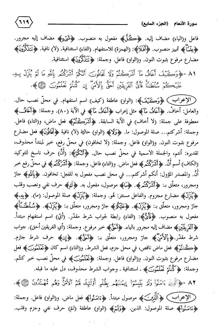 وجملة: أشركتم ... صلة الموصول: ما. {وَلا} (الواو) حاليّة (لا) نافية {تَخافُونَ} فعل مضارع مرفوع بثبوت النون. و (الواو) فاعل. وجملة: (لا تخافون) في محلّ رفع، خبر لمبتدإ محذوف، تقديره: أنتم، والجملة الاسمية في محلّ نصب حال. {أَنَّكُمْ}: (أنّ) حرف ناسخ للتوكيد (الكاف) اسم أنّ. {أَشْرَكْتُمْ} فعل ماض. و (التاء) فاعل. وجملة: {أَشْرَكْتُمْ} في محلّ رفع خبر أنّ. والمصدر المؤول: أنكم أشركتم ... في محل نصب مفعول به للفعل: تخافون. {بِاللهِ} جارّ ومجرور، متعلّق ب: {أَشْرَكْتُمْ}. {ما} موصول، مفعول به. {لَمْ} حرف نفي ونصب وقلب {يُنَزِّلْ} مضارع مجزوم. والفاعل مستتر: هو. وجملة: {يُنَزِّلْ} صلة الموصول: (ما). {بِهِ} جارّ ومجرور، متعلّق ب: {يُنَزِّلْ}. {عَلَيْكُمْ} جارّ ومجرور، متعلّق ب: {يُنَزِّلْ}. {سُلْطاناً} مفعول به منصوب. {فَأَيُّ}: (الفاء) رابطة لجواب شرط مقدّر. (أيّ) اسم استفهام مبتدأ.